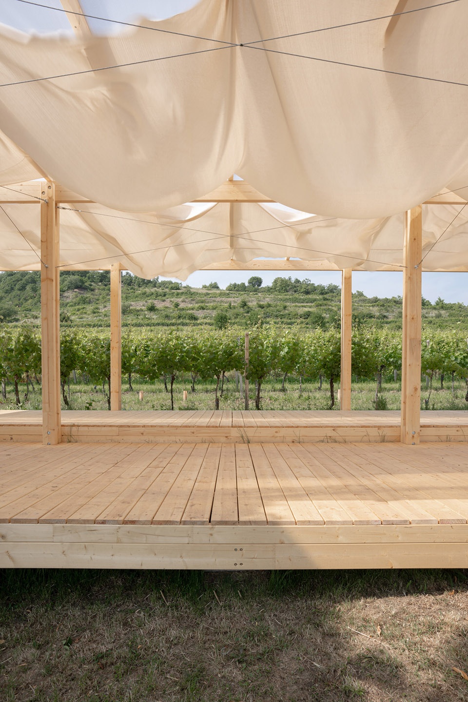 The festival area is divided into several linear zones converging at a central point in the northern part. The layout derives from functional relationships, topography, and the vineyard surroundings. The diverse spatial elements, sometimes accentuating novelty and other times blending into the environment, create a varied spatial composition harmonized by the rhythm of the vineyard rows.