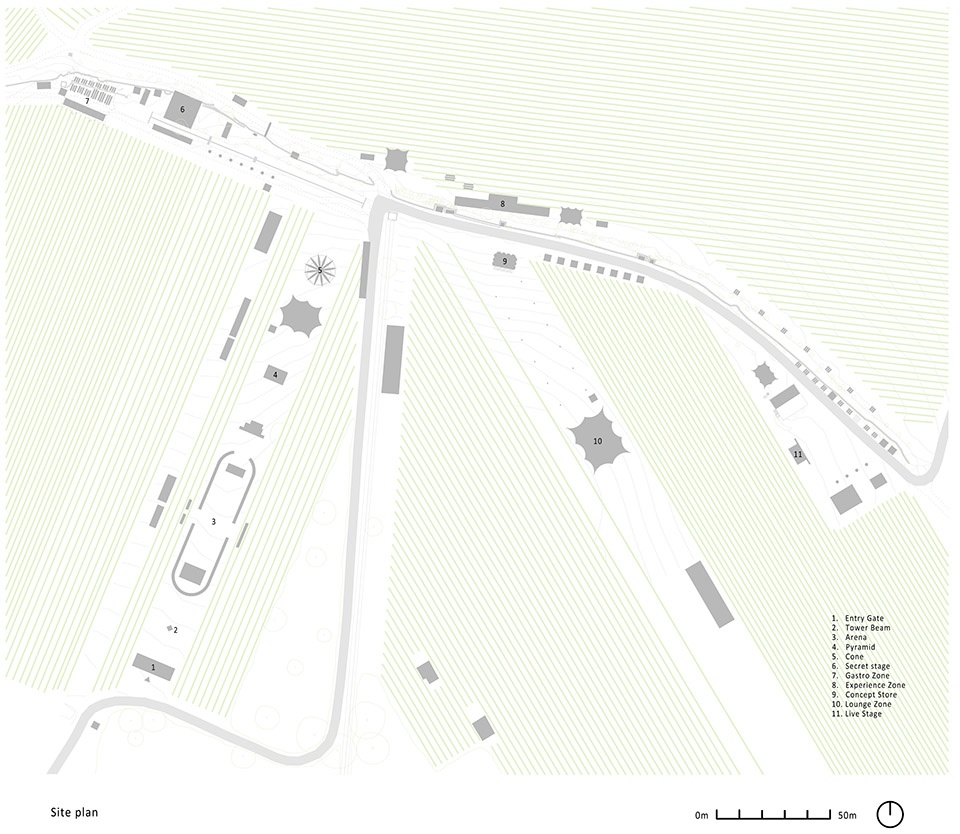 入口轴线两侧的建筑结构按逻辑有序排列,保持对称性。配有灯塔的入口大门,与主舞台区域、金字塔结构及其他区域在一条轴线上。西侧区域为餐饮区与“秘密舞台”所在,是一个具多功能可变用途的俱乐部空间。北侧葡萄园中设有“体验区”——一个能在藤蔓间舒适放松的展亭。临时性“概念商店”位于通往“休闲区”的光影走廊入口,后者是一个供休憩与演讲的小空间。最东端设有“现场舞台”,为桁架结构,可远眺葡萄园景色。