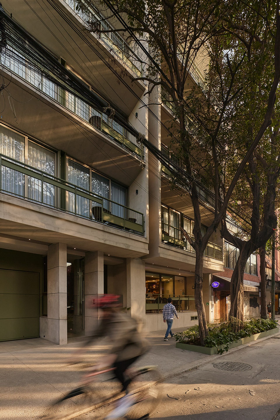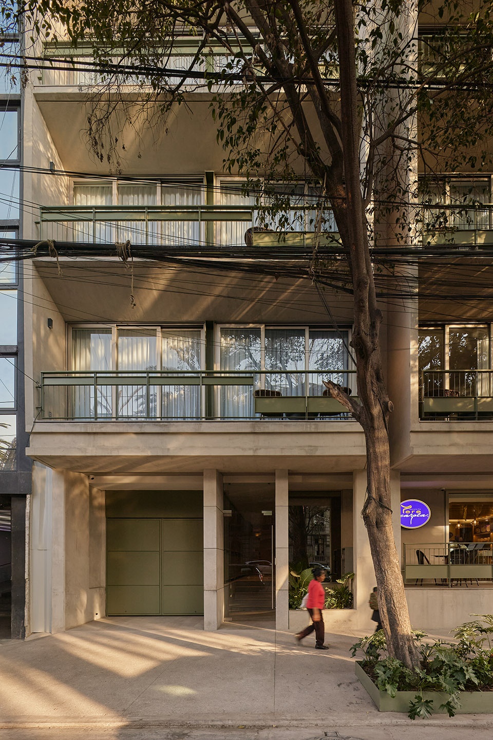 Oaxaca 88大楼位于墨西哥城Condesa街区,是一座融入充满活力的城市环境中的混合功能建筑。项目包含26套住宅单元及一层临街商业空间,由两个体量构成,并通过中央垂直交通核心相互连接。建筑的结构模数在立面上得到清晰呈现:北立面分为两个板块,南立面则划分为三个部分,呼应了公寓内部的布局逻辑。建筑材料以清水混凝土为主,结合绿色金属构件,并配有宽敞的阳台与露台,可远眺城市地标。
