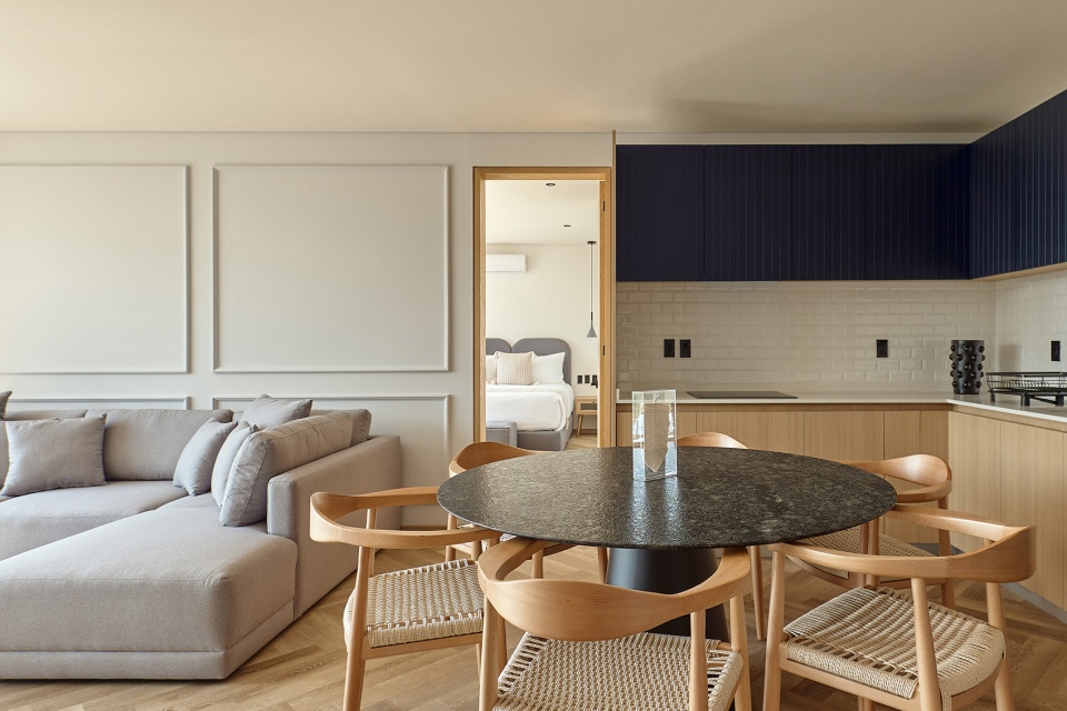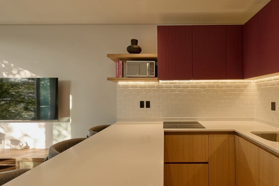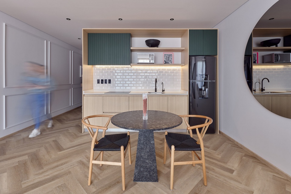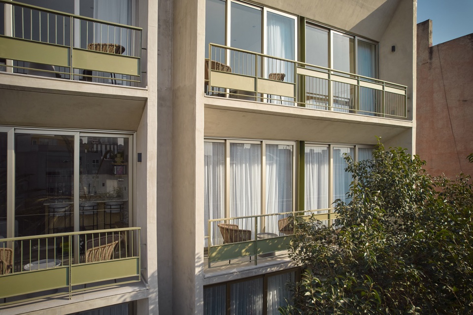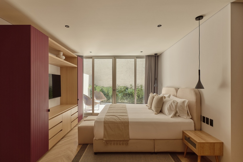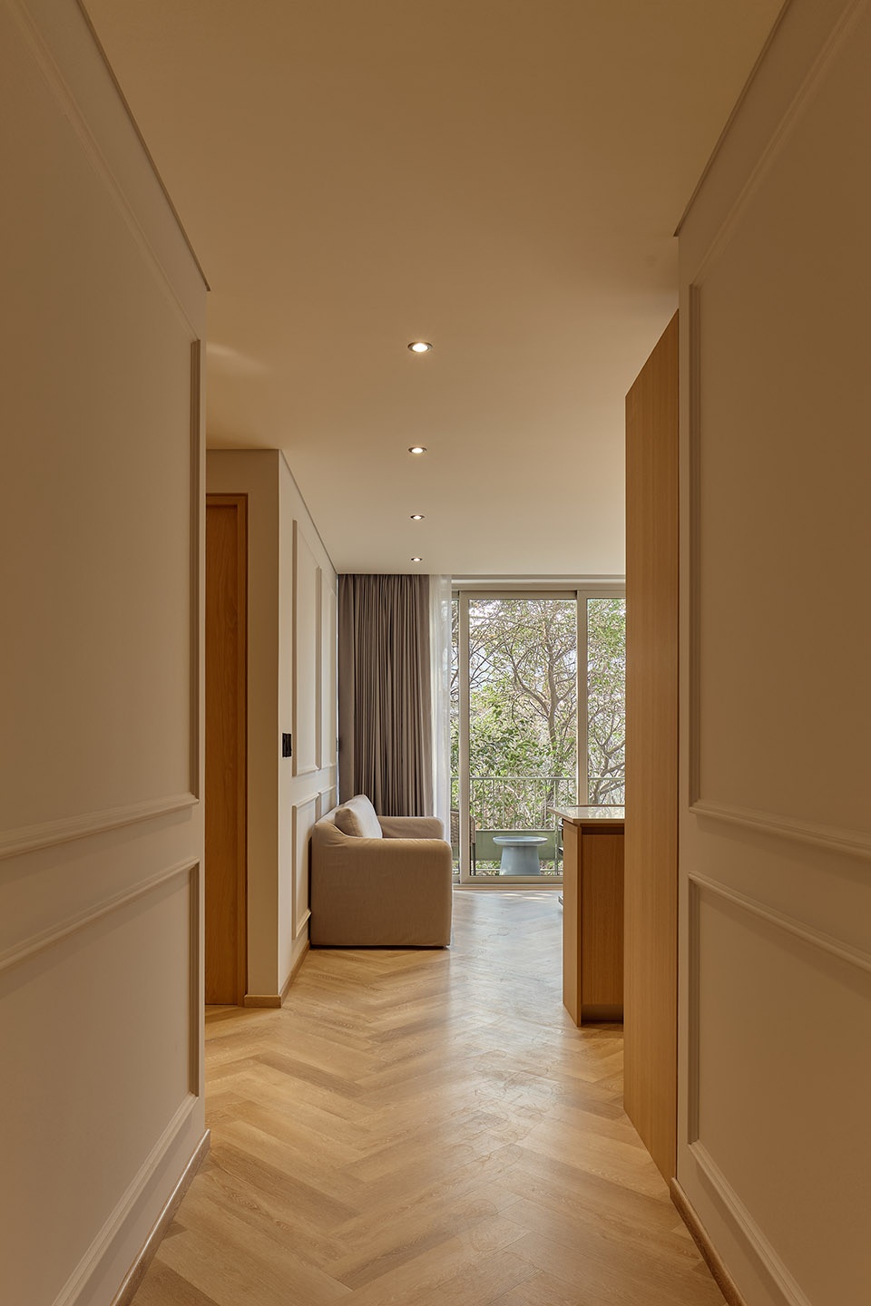 木作以浅色木材为主,部分单元采用多功能家具设计,例如兼具衣柜与电视柜功能的一体化构件,并辅以局部色彩点缀,丰富空间氛围。建筑外部的清水混凝土与绿色铁艺栏杆相互映衬,与立面前方的大树自然融合。立面采用可完全开启的窗框系统,实现室内外空间的无缝衔接。