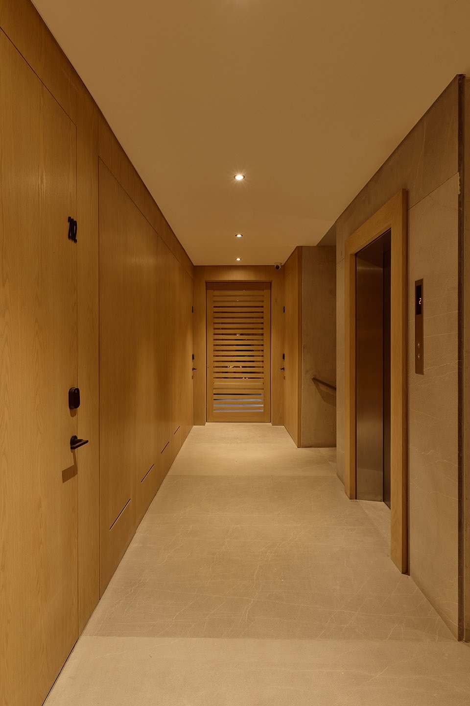 整个建筑严格遵循结构模数系统,这一系统贯穿于材料选择、室内布局与立面设计中。北侧主立面被划分为两个部分,清晰展现出室内公寓的分区关系,其中两块混凝土板之间形成的凹槽细节成为立面亮点。