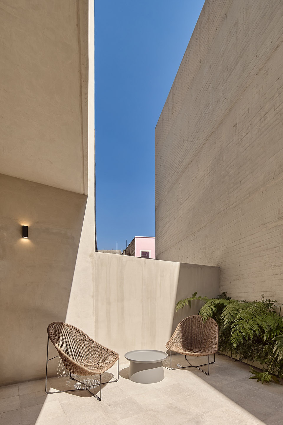 Oaxaca 88 is located between two major public spaces in Mexico City: the “Fuente de Cibeles” and “Parque España”, in the Condesa neighborhood.It is set within a vibrant urban context, surrounded by lush greenery.Situated on an irregular plot measuring 27m by 15m, the project is articulated through two interconnected volumes by a vertical circulation core.