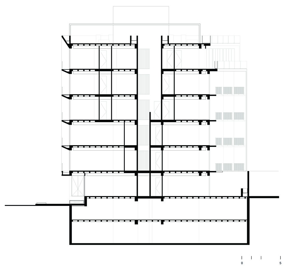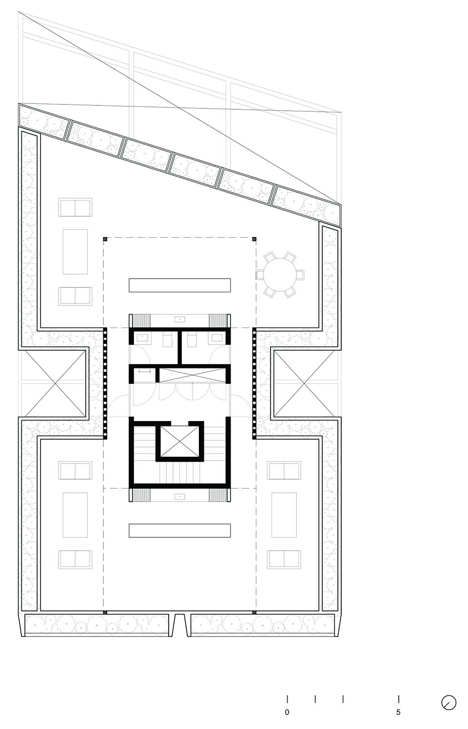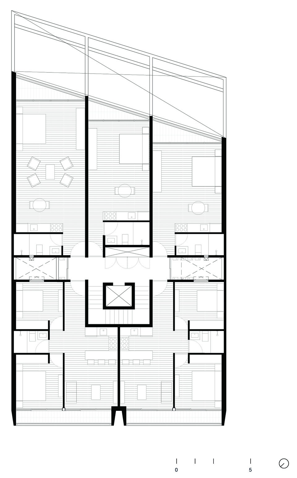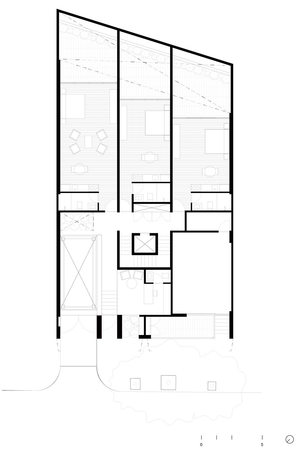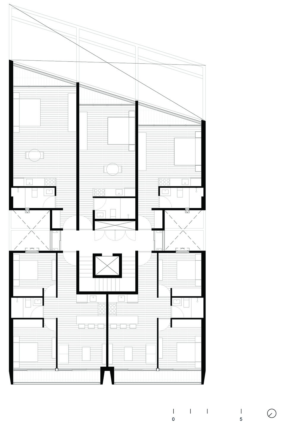 规划包括26套小型住宅单元,面积从最小的38平方米至最大117平方米不等(唯一的顶层公寓),并设有屋顶空间及临街商业区域,与人行与车行出入口相邻。面对场地特征,设计首先决定将体量分离:一部分位于地块前端,另一部分位于后端,两者通过垂直交通核心连接,从而实现住宅单元的南北朝向。