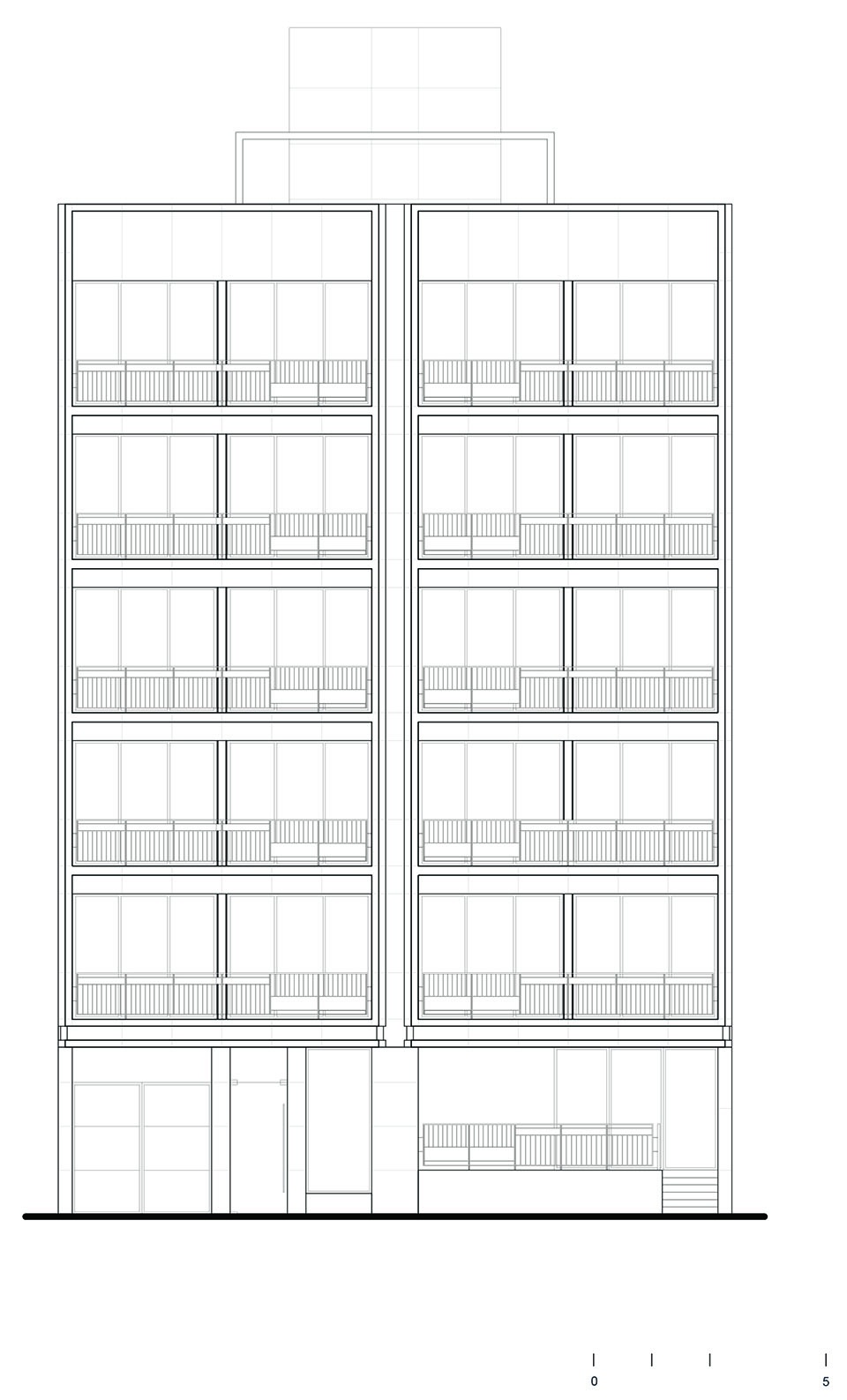 而在南侧后立面,模数转化为三个部分,不仅清晰区分了地下一层的停车空间,也有效组织了上部的小型住宅单元类型。这种网格化的组织方式在平面与立面上都体现出明确的秩序感。