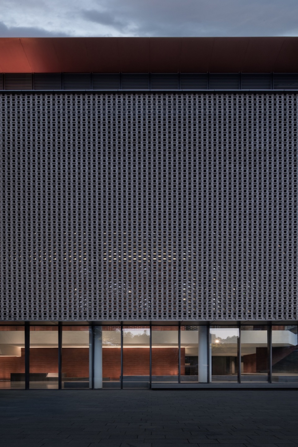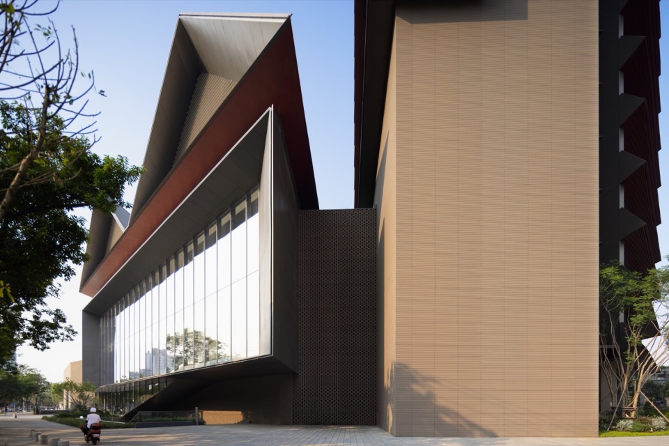 川大历史建筑的典型元素——挑檐、青砖和坡顶歇山,在新馆中进行转译。檐口底部采用川大标志性的红色,强化了文化认同感。入口大厅的镂空砖外墙采用不锈钢拉杆串联陶砖的构造,创造巨幅的“光之墙”。三角形坡屋面采用钛锌板替代传统瓦。高层综合楼的形式参考了邻近望江公园里的望江楼,再现传统多层楼阁的层层屋檐,并利用披檐底部的百叶形成通风腔,将形态设计与环境调控相接合。川大博物馆组群的改造与扩建,重塑了滨江的公共空间,成为锦江沿岸上的重要城市人文节点。