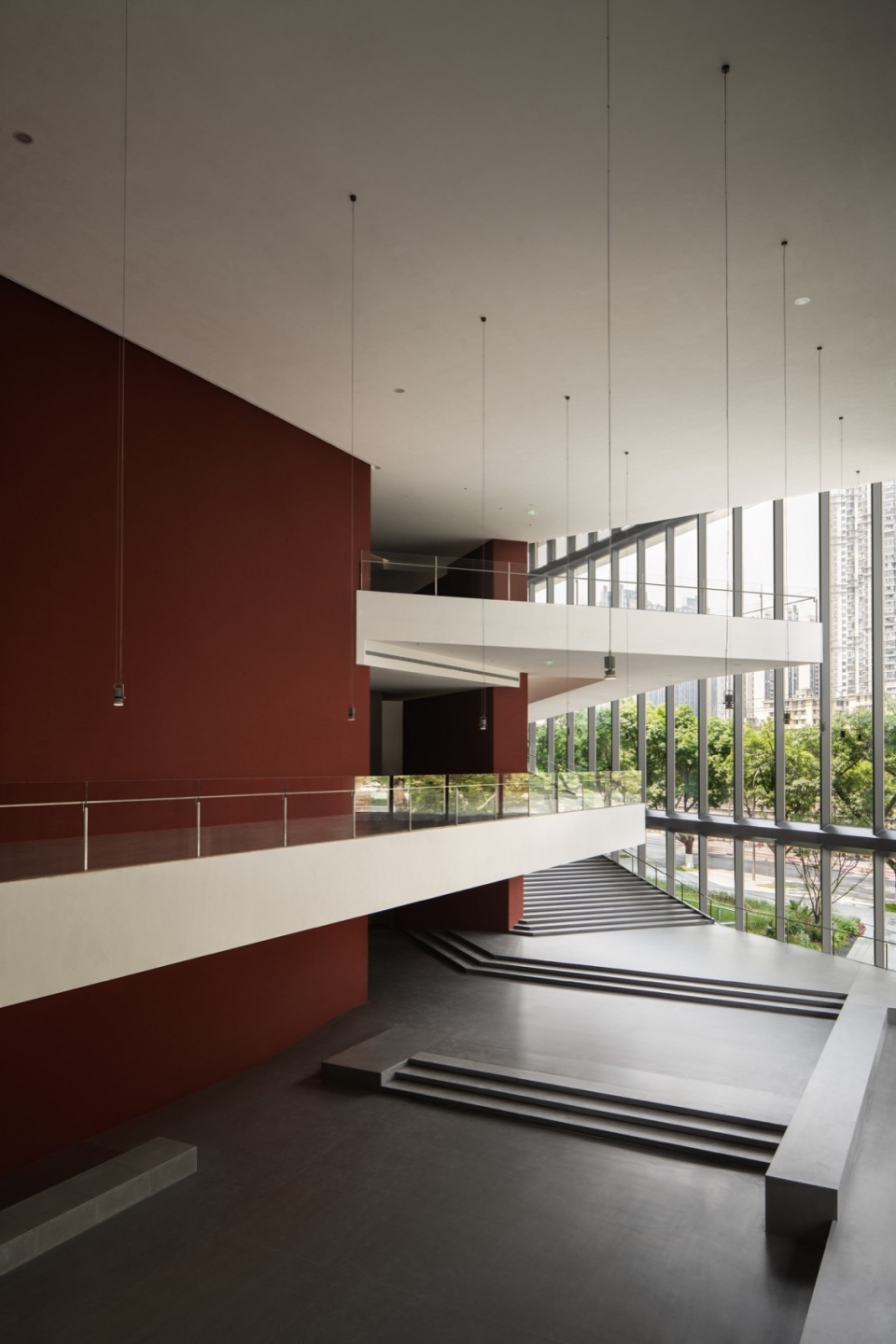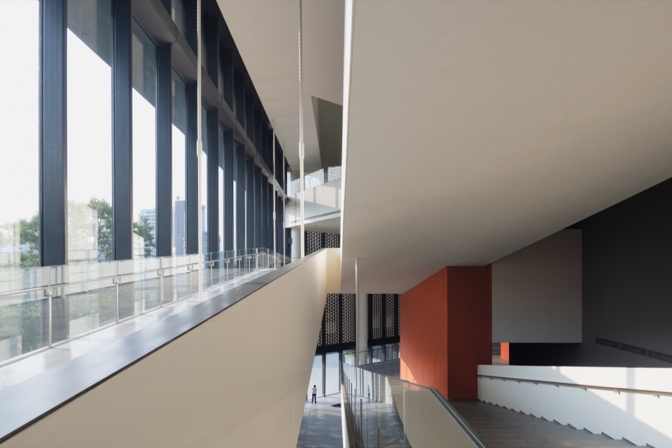 扩建后的博物馆采用“一馆两翼”的布局,新老馆之间设置通高公共大厅,作为核心的空间枢纽。观众可通过门厅扶梯便捷到达各个楼层,也可从大厅沿江一侧的景观坡道盘旋而上,沿途眺望锦江风光。坡道外侧为超大板块玻璃幕墙,形成画框般的景象,实现博物馆与城市环境的对话。