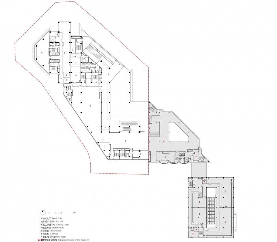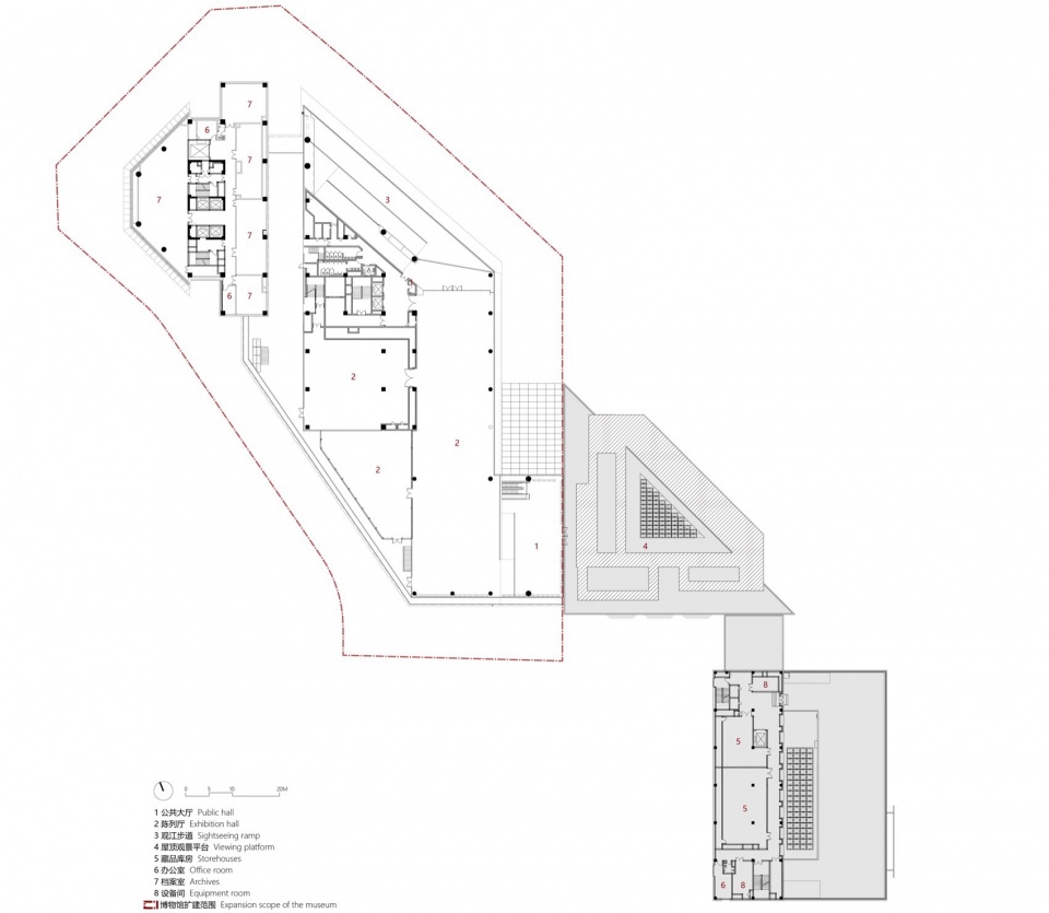 The museum complex consists of two primary elements: the renovated original structure and a new extension. The 20-year-old existing building comprises the former Humanities Pavilion and Natural History Pavilion, totaling 14,700 m². The Natural History Pavilion has been functionally converted into collection storage due to its low ceiling height, while the Humanities Pavilion has been spatially reconfigured to integrate with the new building. The new extension provides 20,000 m² of space, with a high-rise mixed-use complex attached to the north supplying 18,700 m² of research and office spaces.