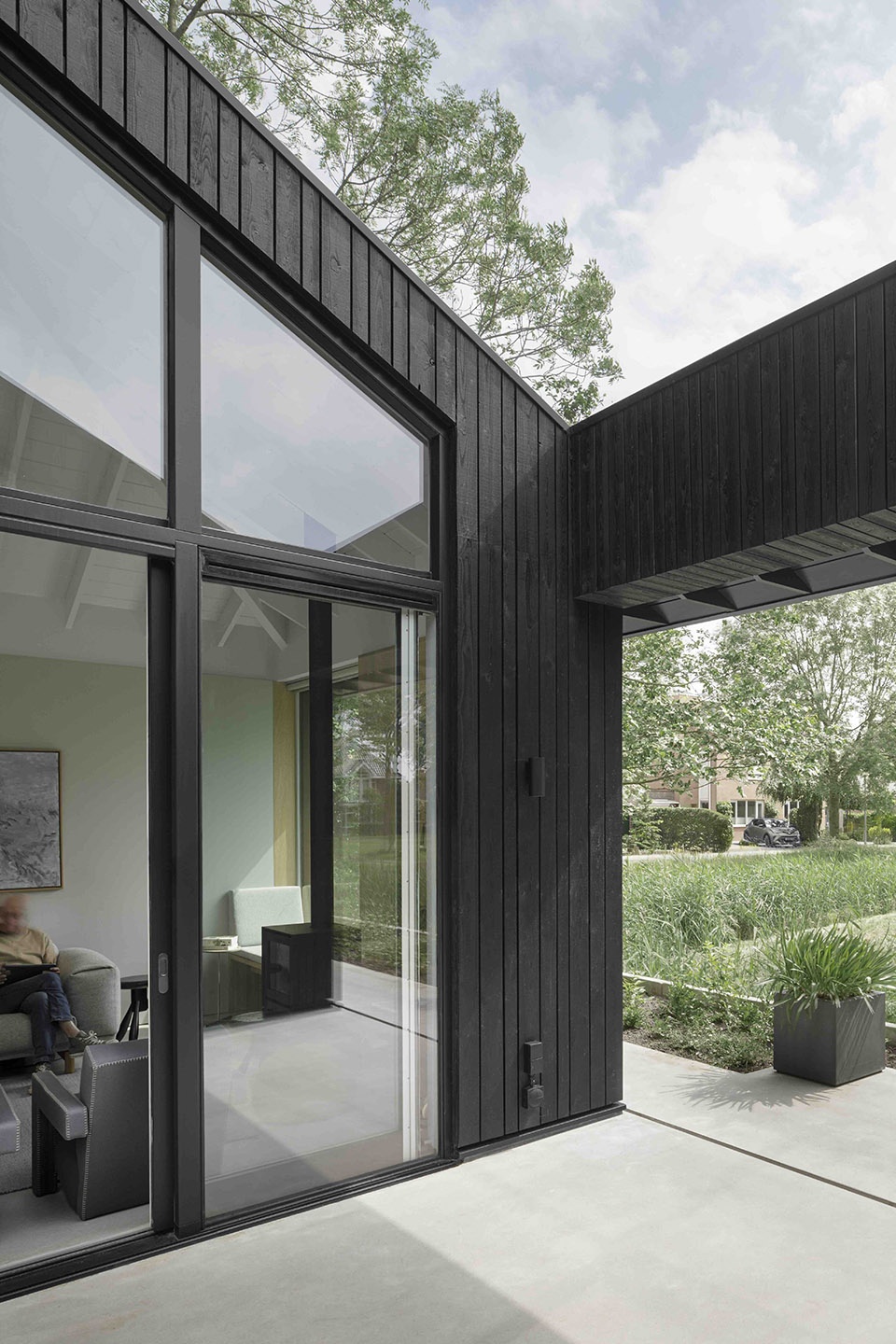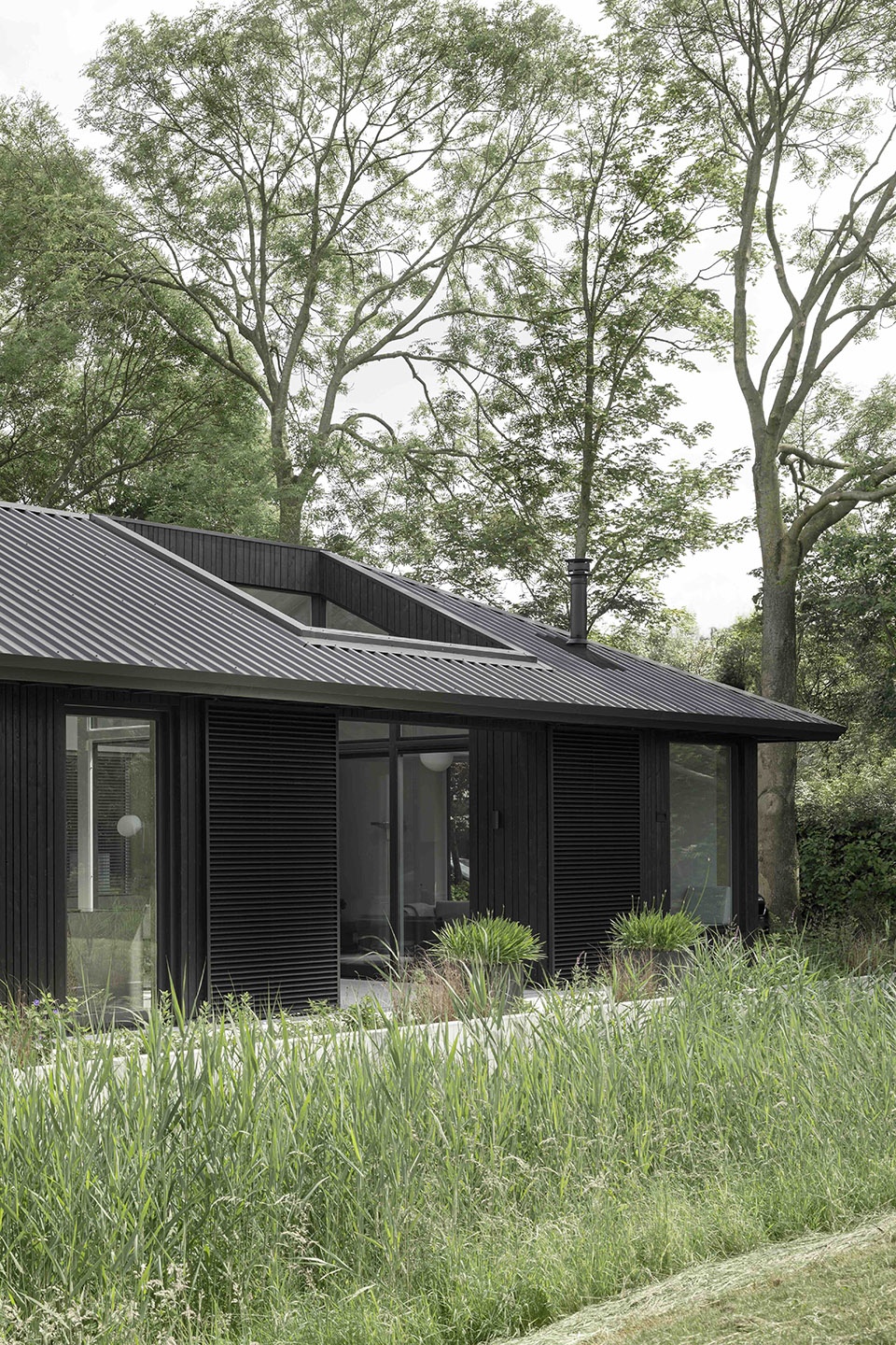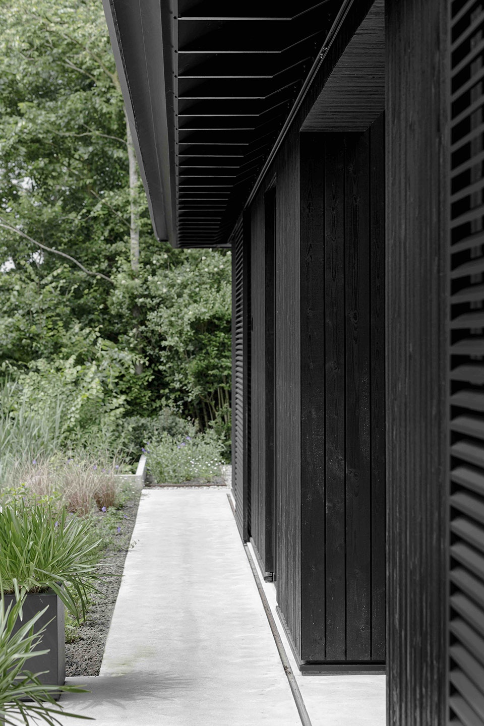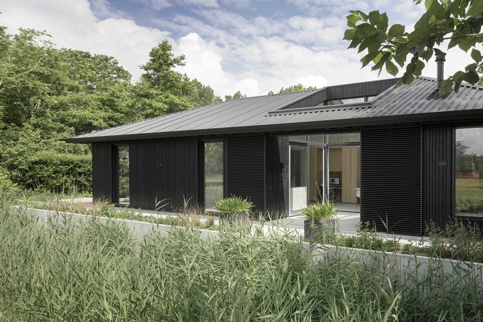 The house radiates calm confidence. Its waxed-wood façades support a contemporary roof made of sandwich panels with integrated, minimalist rain gutters. The roof extends beyond the structure, creating sheltered walkways and heightening the sense of space from within. Inside, the exposed roof plays a key role in the spatial experience, serving as a unifying element between the home’s functions and the surrounding greenery. The interior—featuring a light grey concrete floor, light oak walls, and a white-painted rafter ceiling—creates a serene and natural atmosphere.