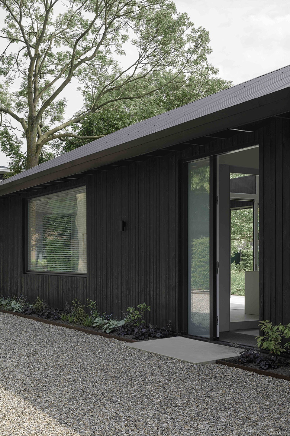 整座住宅散发着沉静而自信的气质。打蜡处理的木质立面与现代感十足的屋顶构造形成鲜明对比,屋顶由夹芯板构成,并内置极简化的排水系统。屋檐向外延伸,形成有遮蔽的步道,也增强了室内的空间感。屋顶在室内空间中扮演着重要角色,它不仅作为视觉焦点统一各功能区域,还与周围的绿意环境形成对话。室内选材以浅灰色混凝土地面、浅色橡木墙面与涂白椽架天花为主,整体营造出静谧自然的氛围。