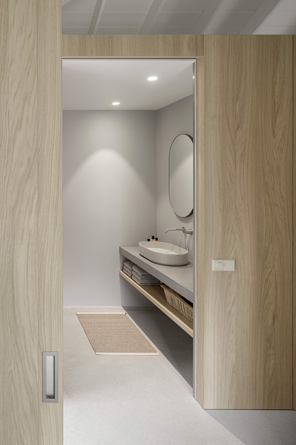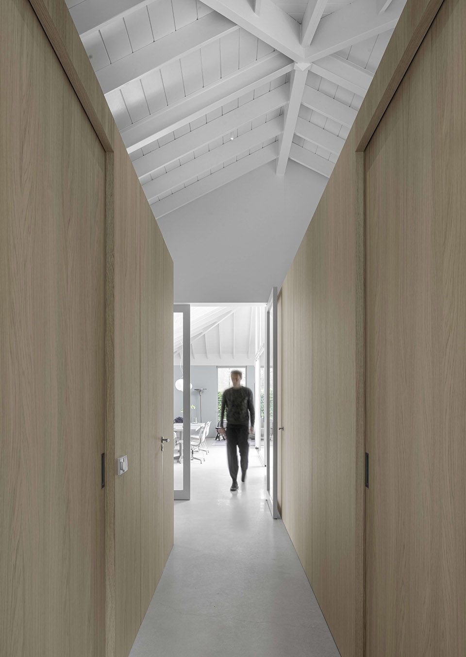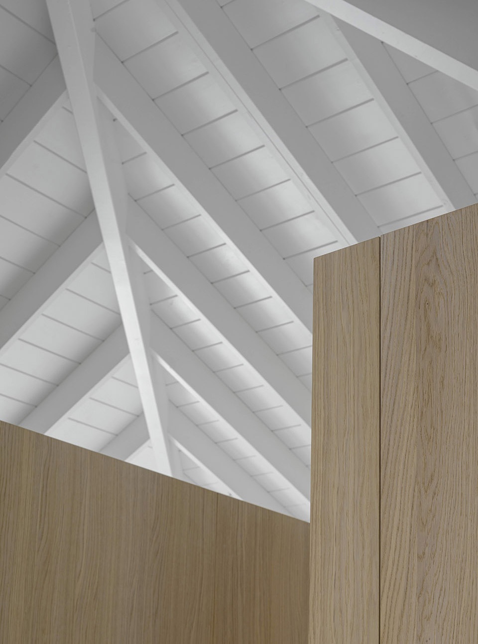 ▼浅灰色混凝土地面、浅色橡木墙面与涂白椽架天花,light grey concrete floor, light oak walls, and a white-painted rafter ceiling