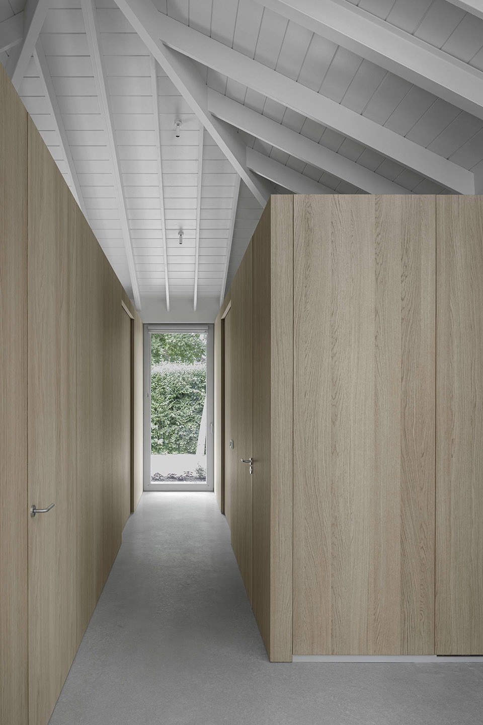 橡木墙面围合空间,支撑屋顶的同时强化了空间的水平感,也强调了挑高空间的开阔感。定制的橱柜与厨房家具沿着同一水平线展开,与建筑语言相得益彰。外墙材质在视觉上延续进室内,与定制家具融为一体,建筑与室内设计在此实现了真正的融合。