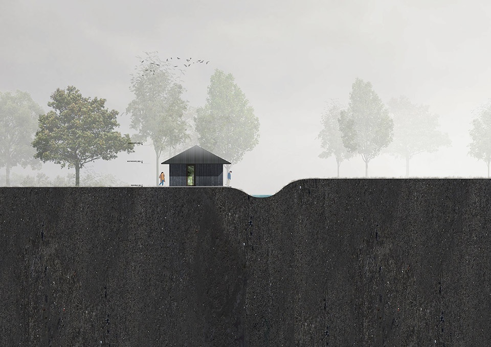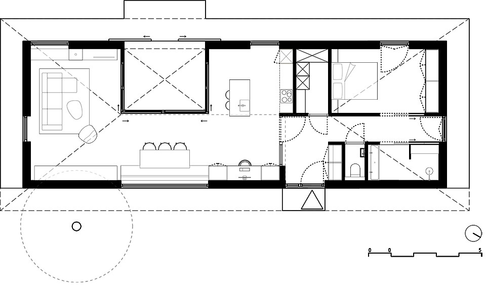 The new building is a single-level home beneath an exposed-rafter roof. On the north side, the bedroom and bathroom form a tranquil zone. Large sliding doors around a centrally located patio offer extended sightlines and an airy, open feel. The patio connects the kitchen, dining, and living areas to an outdoor space that naturally extends the interior. Three fully retractable sliding doors allow a seamless transition between inside and outside, while sliding panels on the west side provide privacy and shelter.