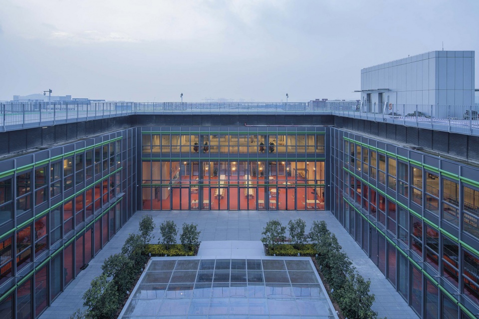 与传统校园不同,该校的“校园层”位于第六层,也就是教学区之上,供学生在此用餐、休憩,俯瞰公园与城市。外围露台与中央庭院种植树木,营造舒适的户外活动空间。屋顶区域亦被设计为可供教学与体育活动使用的场所,与地下运动中心相辅相成。