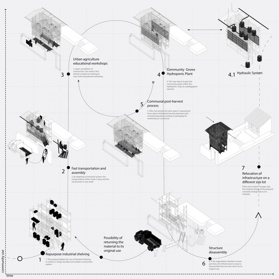 由Alsar Atelier与Oscar Zamora联合设计,并由NEACOL资助的水培模块结构,建筑策略聚焦于将工业货架系统——一种典型的消费性材料——转化为快速搭建、可重复利用的社会化建筑解决方案。鉴于非正规城市建设的临时性与不稳定性,而传统材料如混凝土与砖块却具强烈的永久性,该模块被设想为轻质、半永久结构,更贴合此类地区的现实状态。