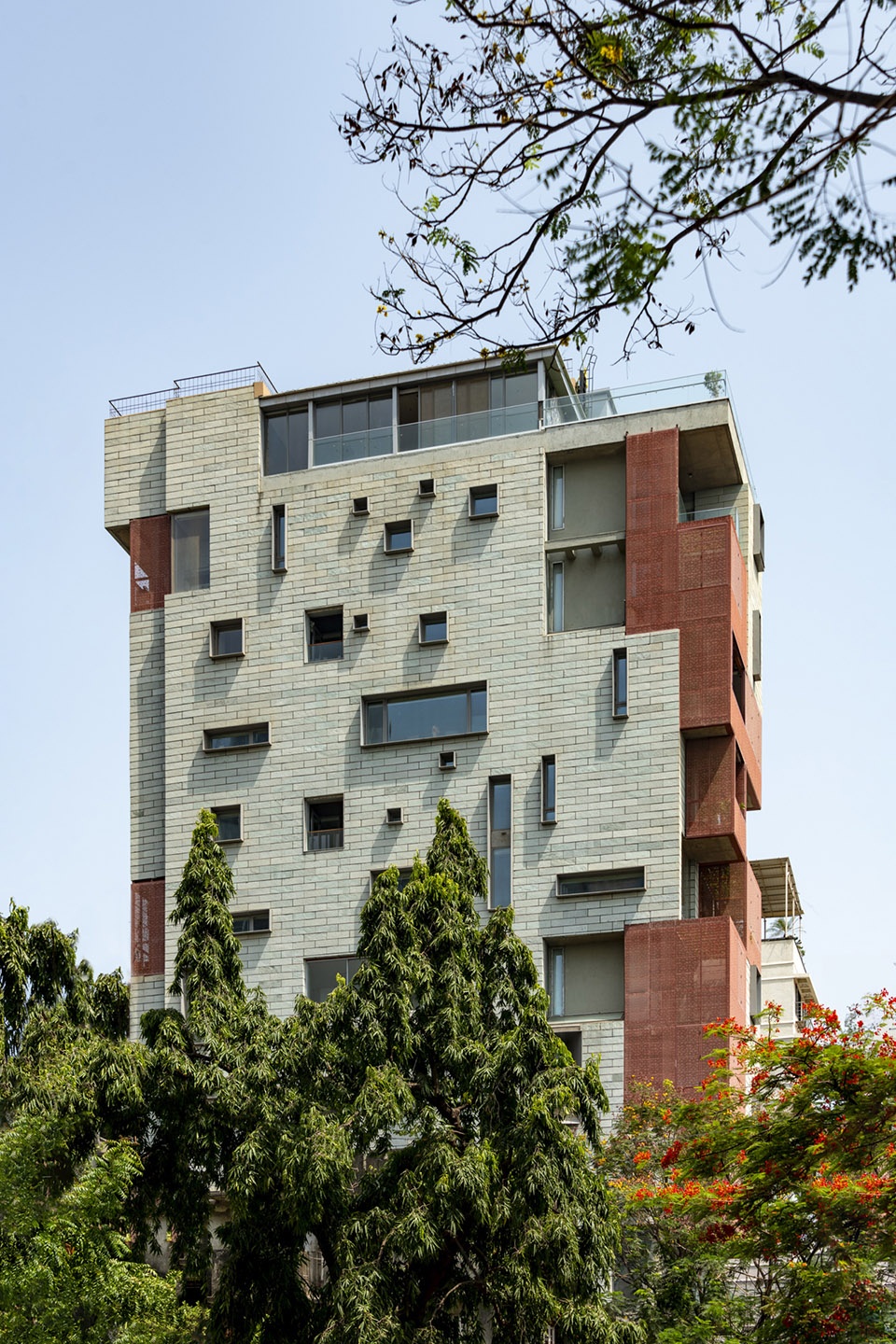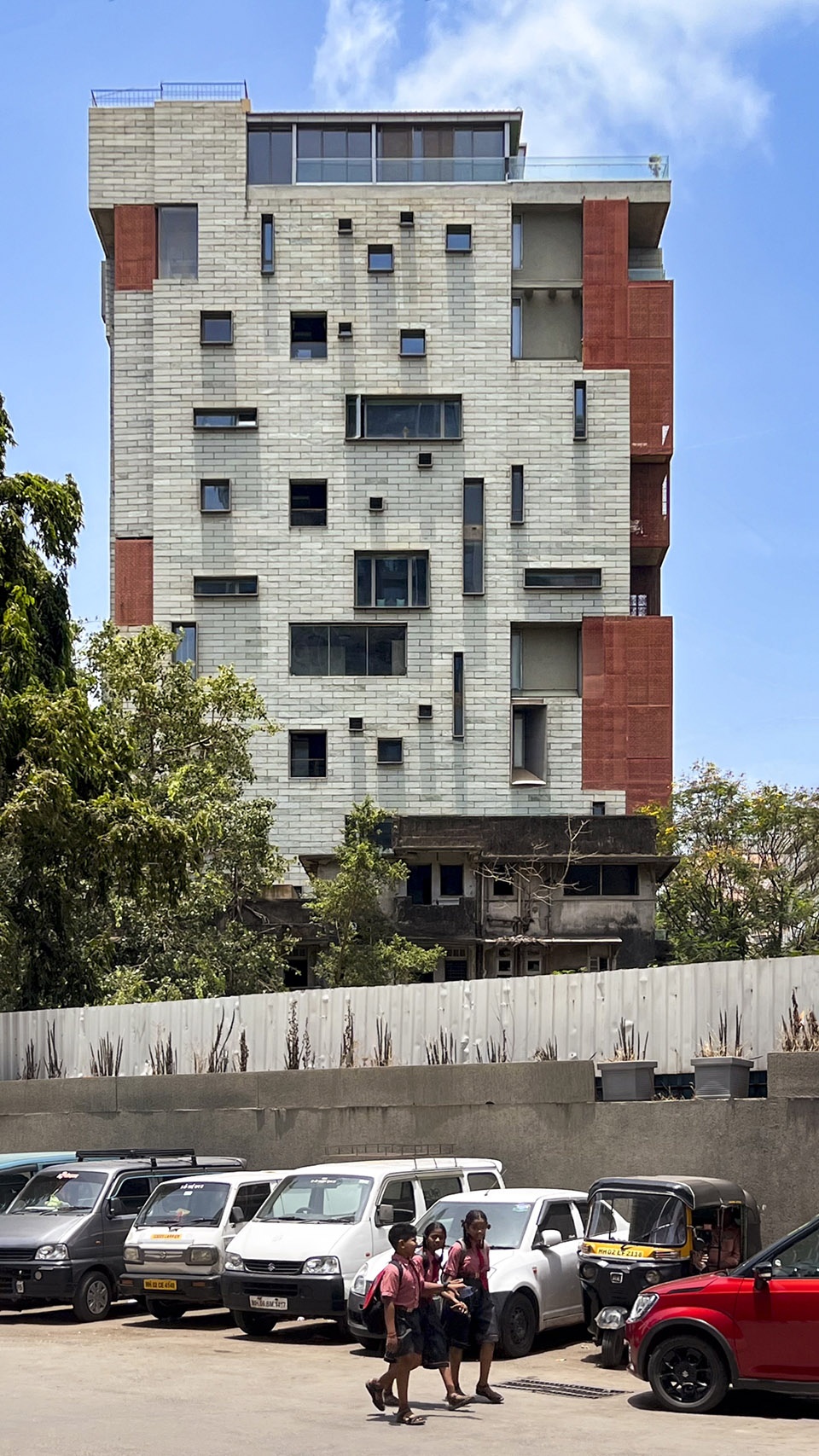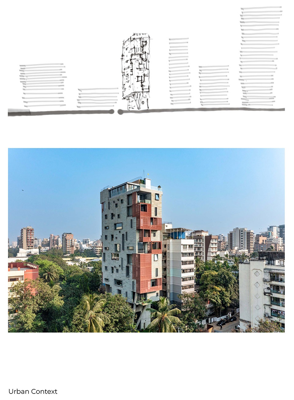 The streets of Khar used to be lined with low rise homes set back from the street and hidden behind trees and shallow front gardens. Densification and the demand for floor space has transformed these neighbourhoods’ into rows of tall structures battling for light and air and eliminating any manner of dialogue with the street, owing to the concentration of “decorative” multi-storey parking structures at the ground level. The sea lies to the west of the site, a direction from which the harshest sun and rain originate.