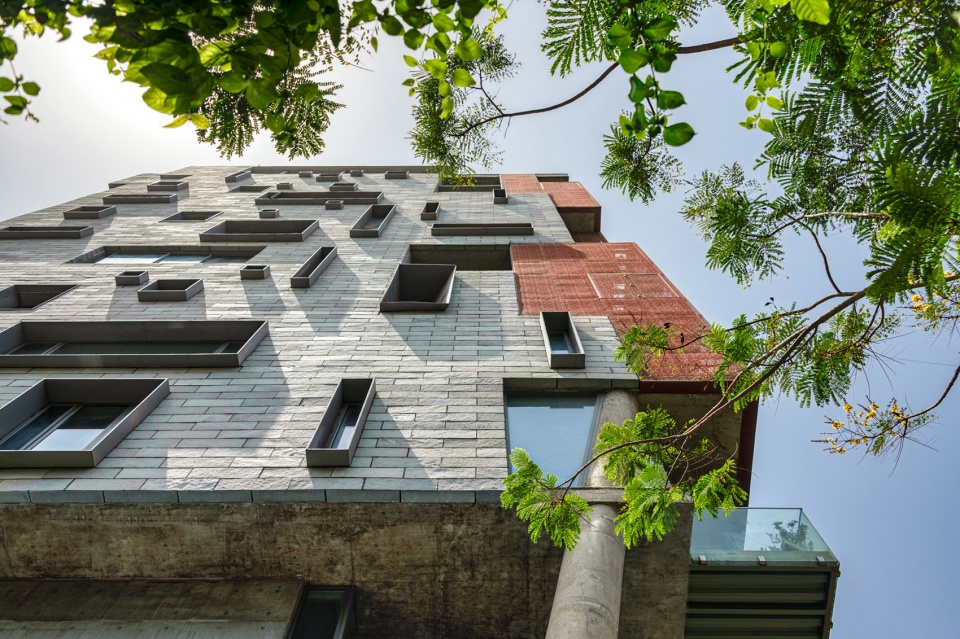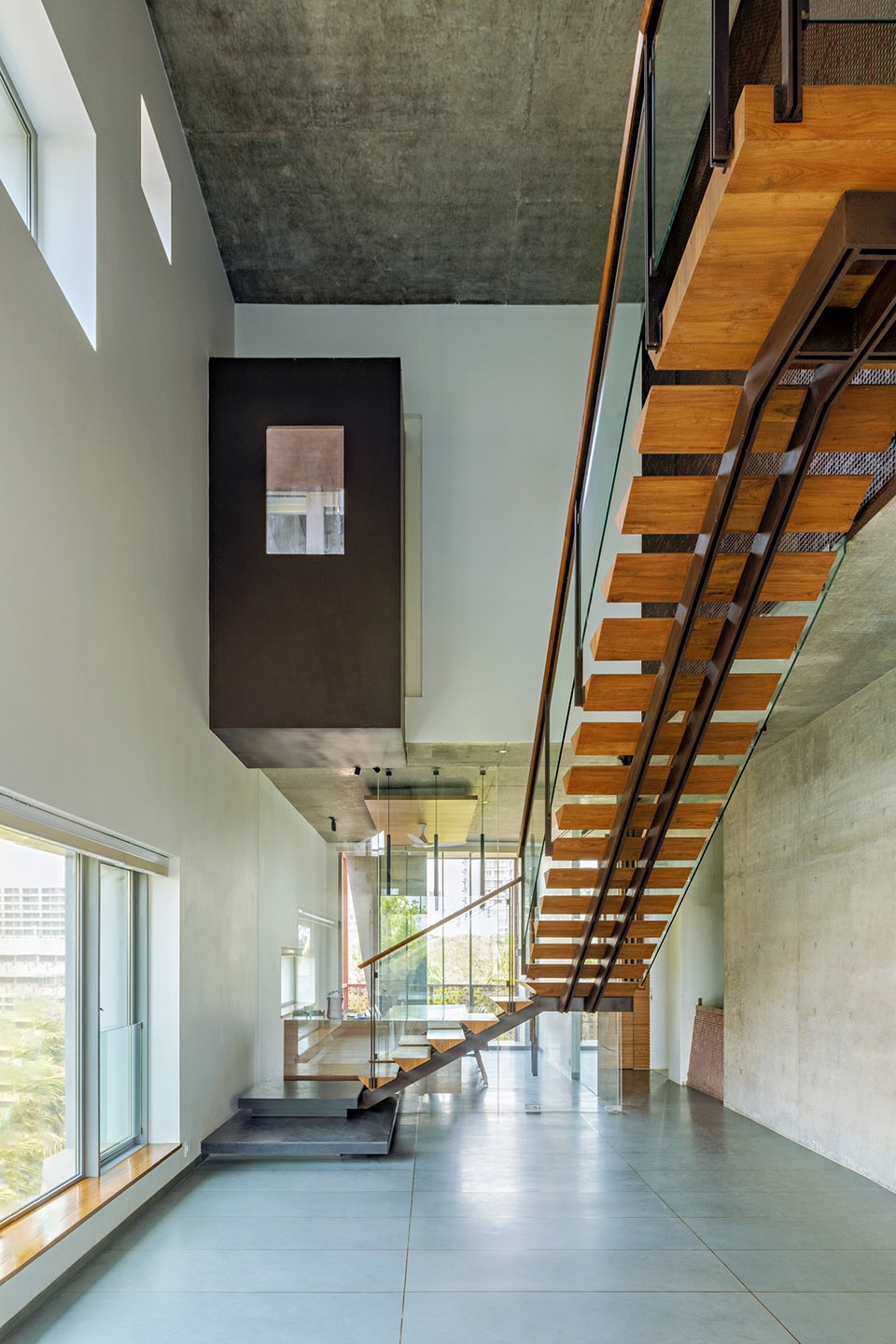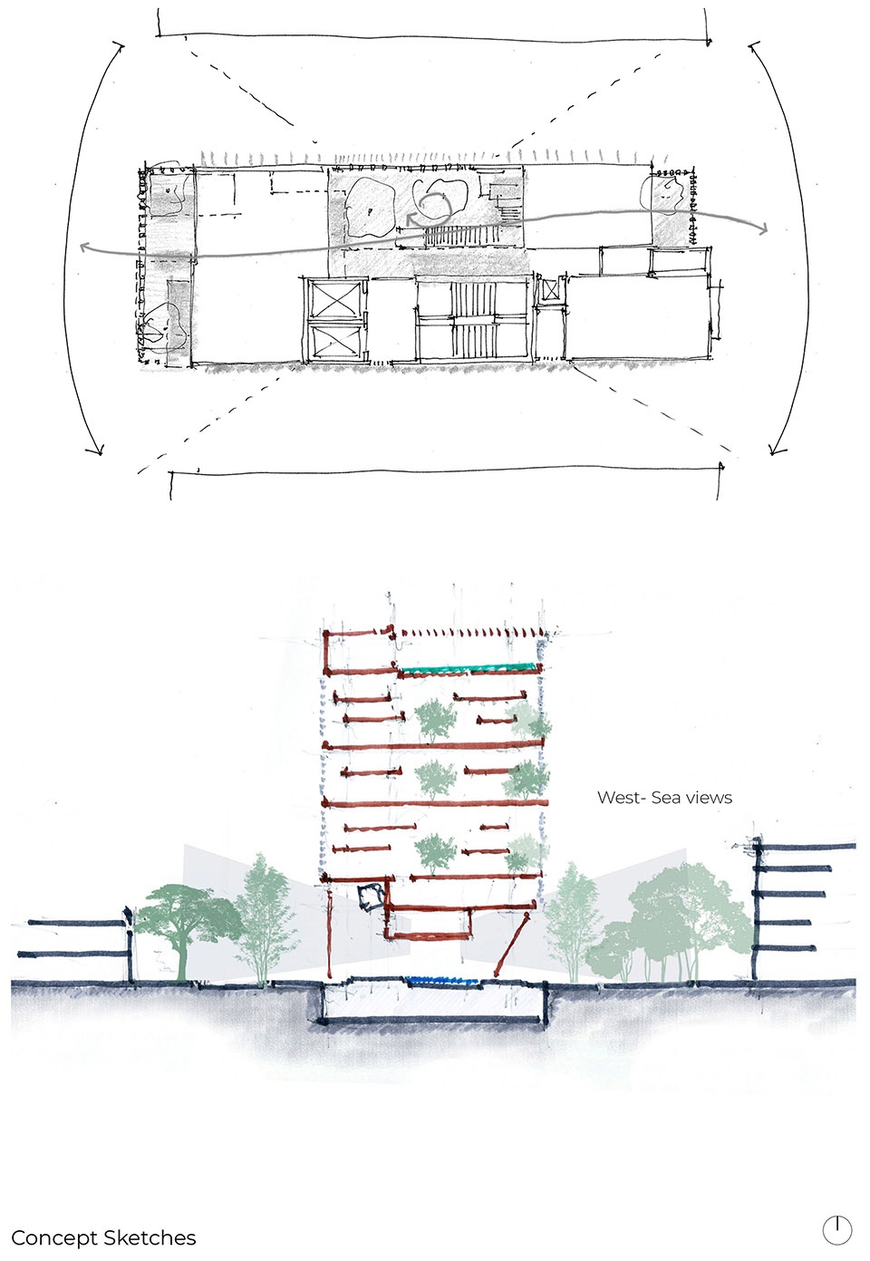 The streets of Khar used to be lined with low rise homes set back from the street and hidden behind trees and shallow front gardens. Densification and the demand for floor space has transformed these neighbourhoods’ into rows of tall structures battling for light and air and eliminating any manner of dialogue with the street, owing to the concentration of “decorative” multi-storey parking structures at the ground level. The sea lies to the west of the site, a direction from which the harshest sun and rain originate.