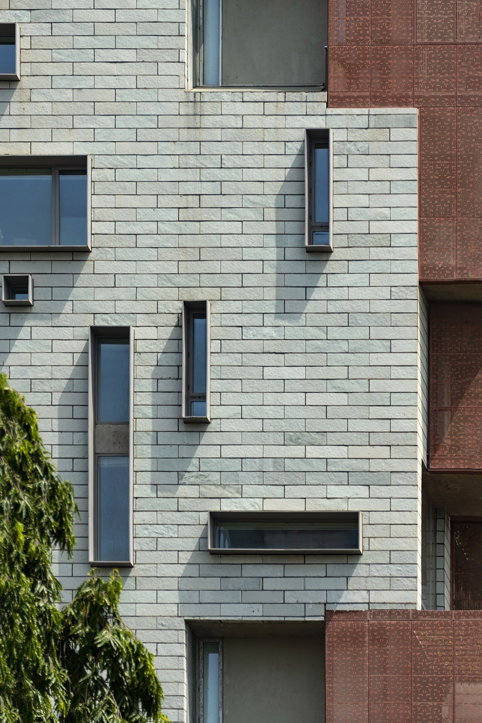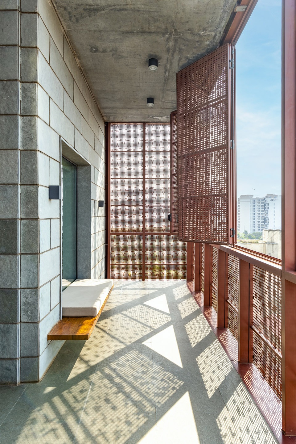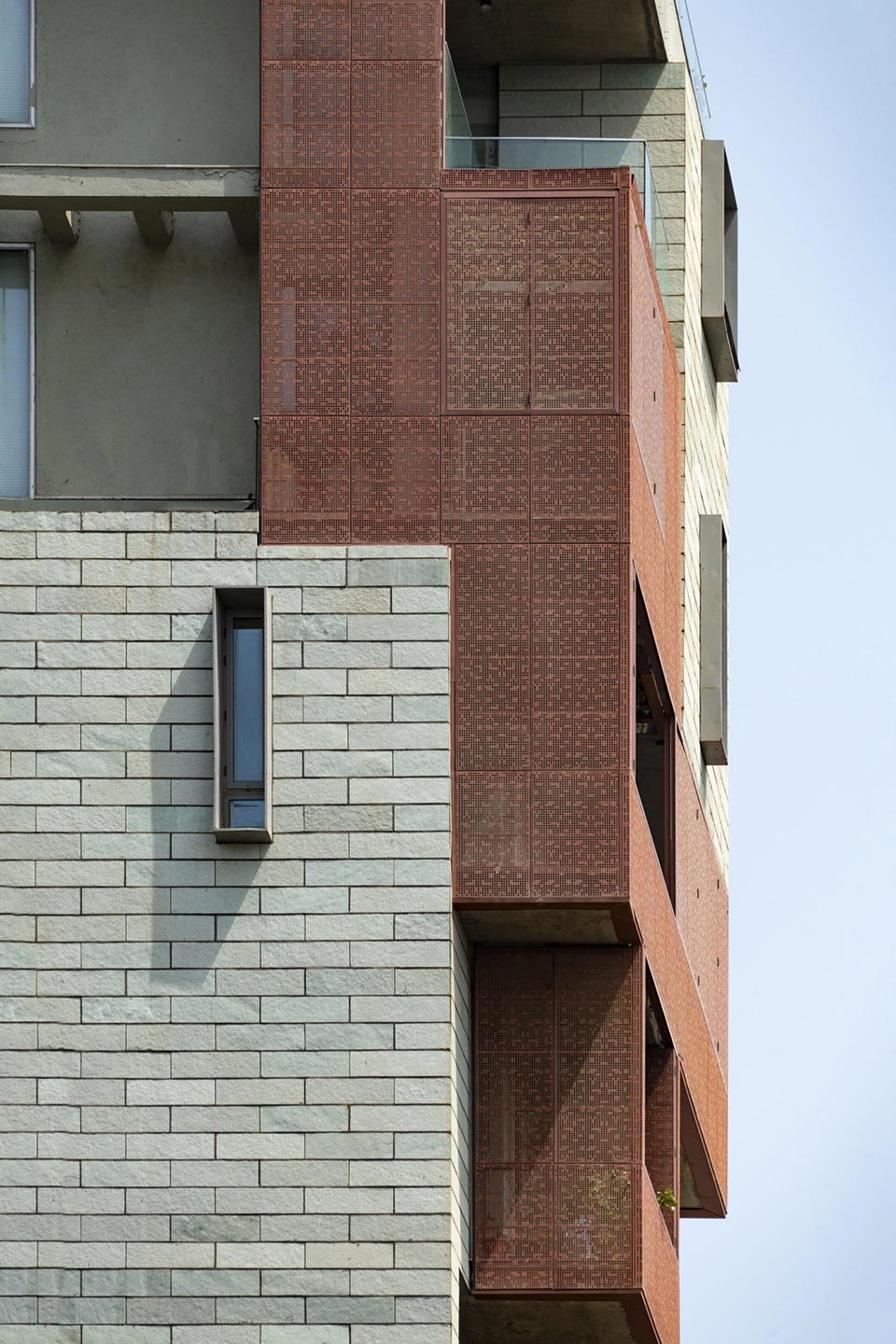 这些廊台根据各户室内布局的不同而产生形式与剖面的变化,使每套住宅形成独立的廊台比例与空间特征。可开启的遮阳格栅既提供隐私保护,又提升遮阳效率,使廊台空间具备全年适居性。