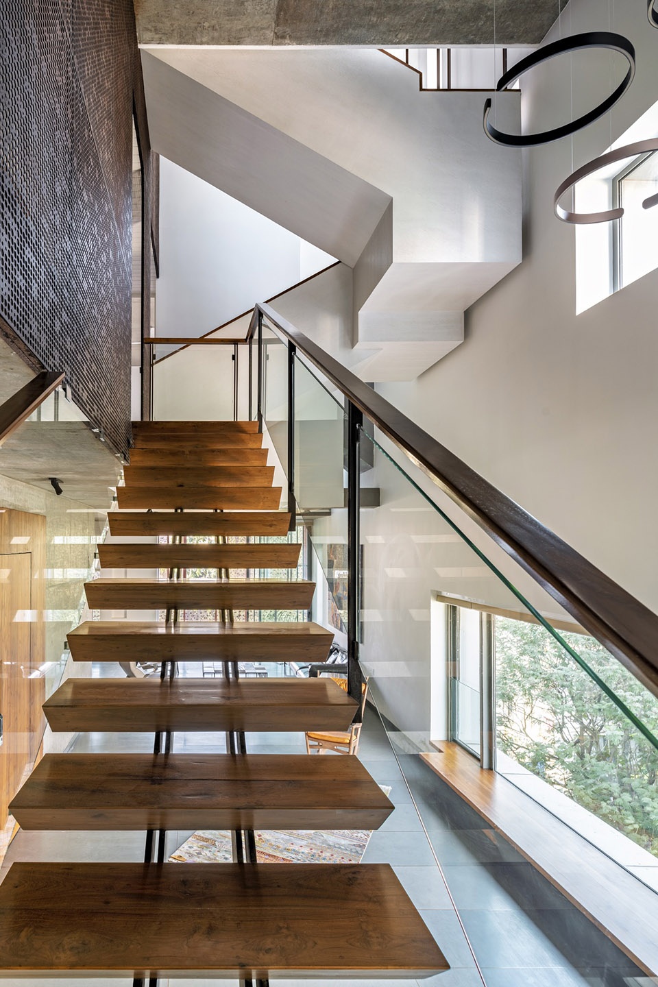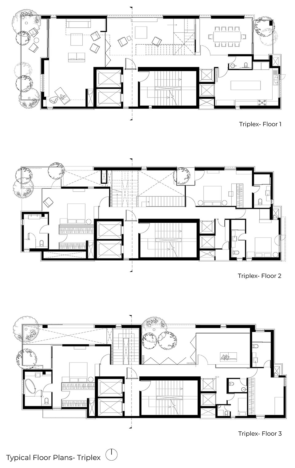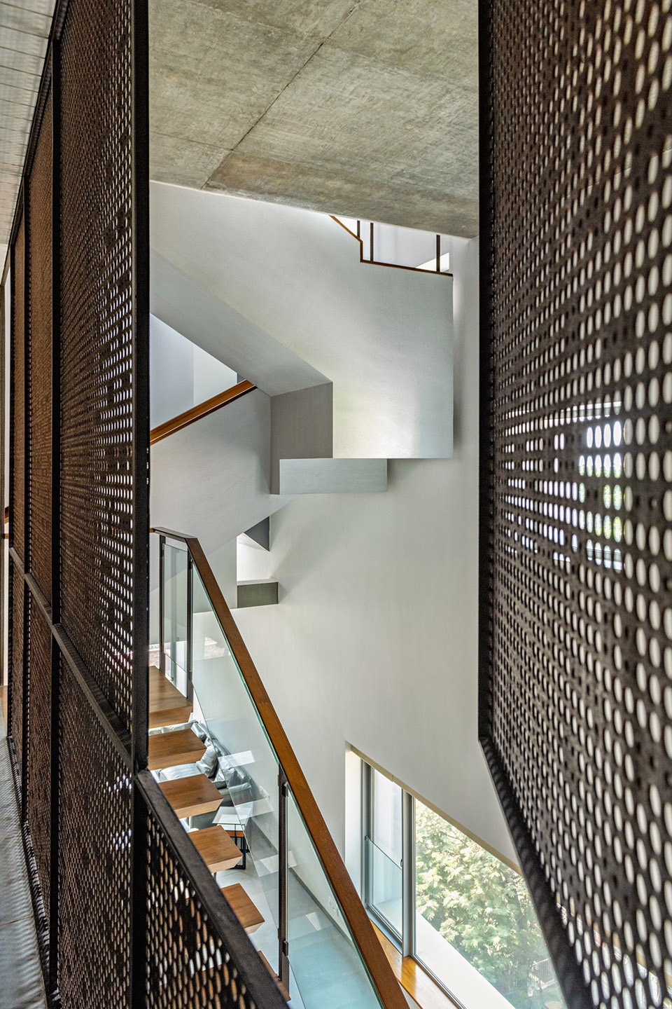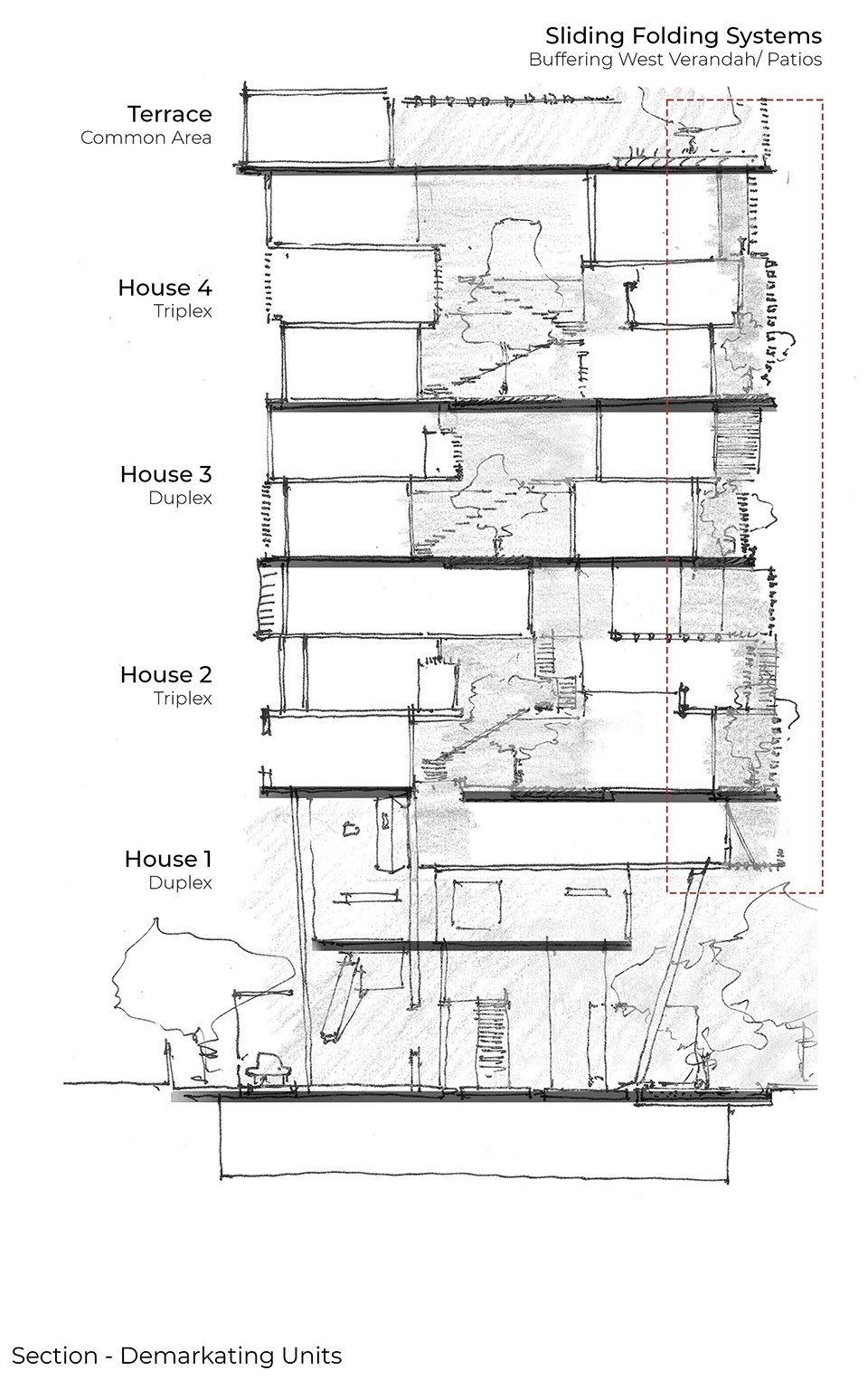 The Verandah spaces shift profiles within this tall void, based on the relationship with the interior, and each bungalow develops its own proportion of verandahs’. The operable screens create privacy and shading making those spaces perennially habitable.