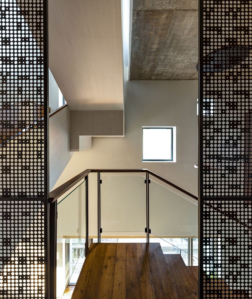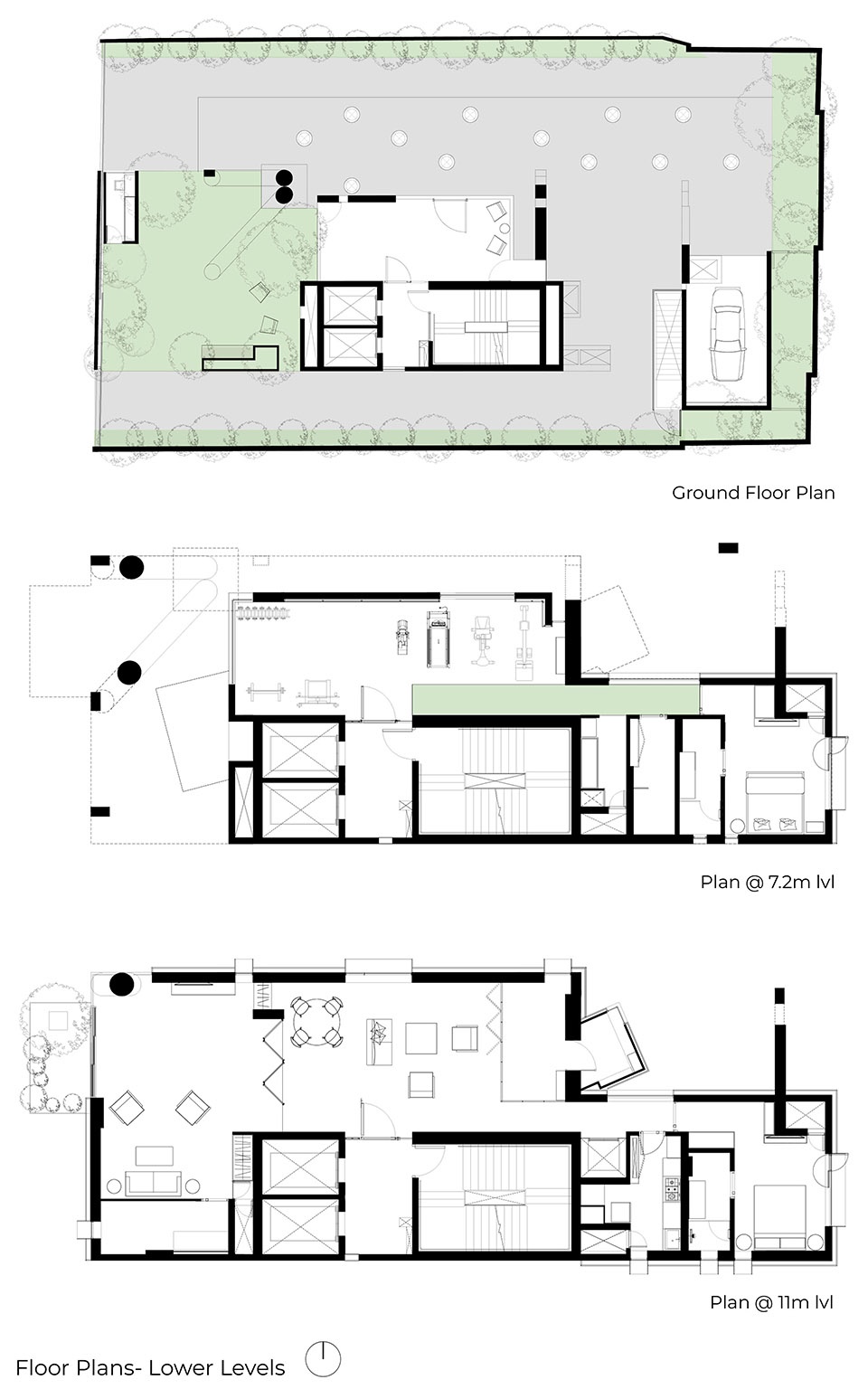 The individual “bungalows” are planned around central north facing courtyards with the public/private spaces located at the east and west zones to establish views into the funnels between the surrounding buildings. The individual courtyards bind the internal spaces and allow for natural light and breezes to flow through the house, behaving, in the hot months, like a thermal stack. Internal shifts in space and structure make the courtyard extend into the private spaces creating a network of deep voids and punctuated skylights. The sensation of living under the sky permeates through the house.