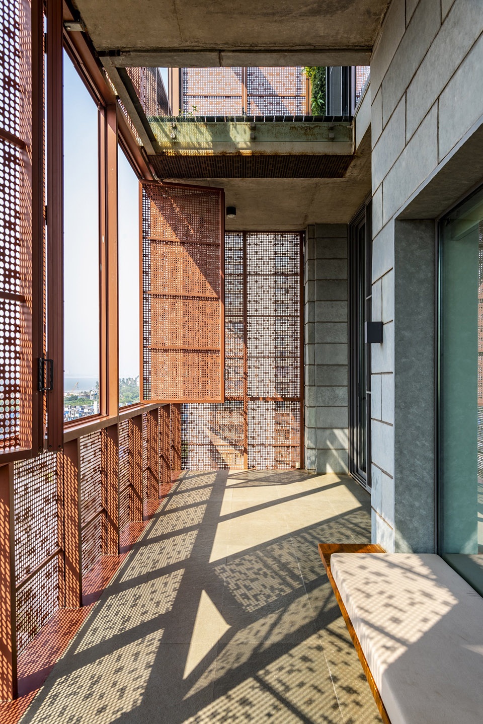 建筑西侧面向大海,亦最容易承受风雨侵袭,故设计为一系列深挑檐的廊台空间,结合固定与可开启的格栅系统。