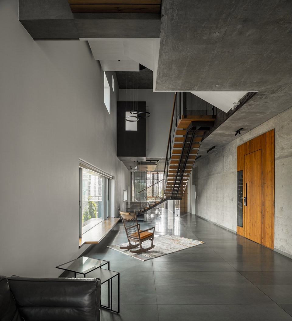 每户“独立宅邸”围绕朝北的中央天井布局,公共与私密空间则分别布置于东西两侧,以便借由相邻建筑之间的“缝隙”获取良好视野。天井将内部空间串联在一起,让自然光与空气贯通全屋。炎热季节时,天井如同热烟囱般发挥自然通风作用。结构与空间的灵活变化也使天井自然渗透至私密区域,形成一个由深层庭院与天窗构成的空间网络,带来“居住在天空下”的沉浸式体验。