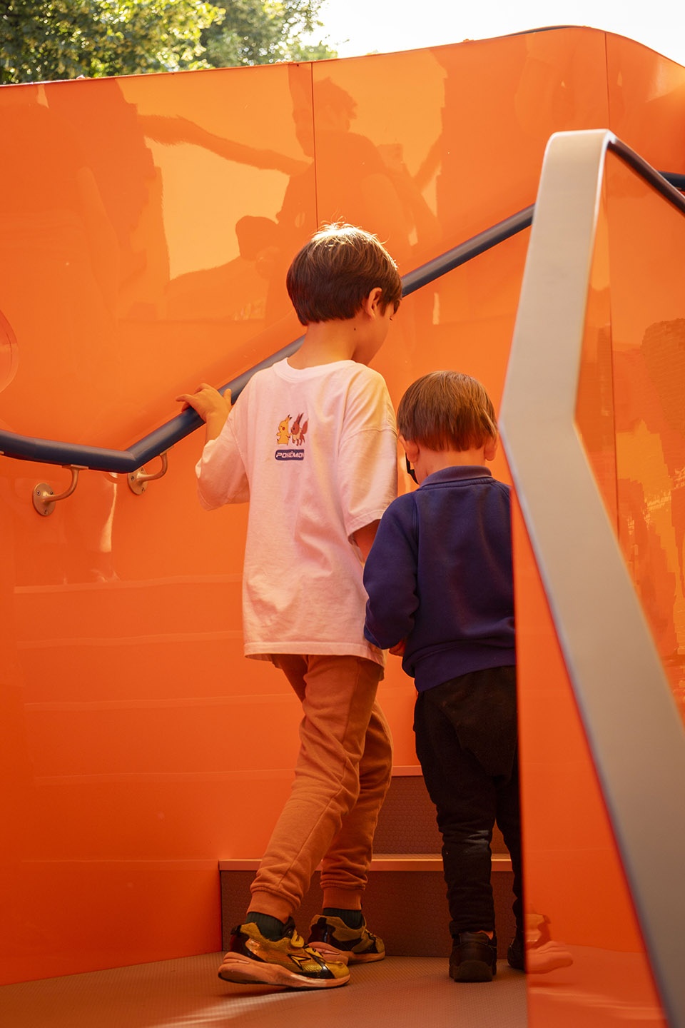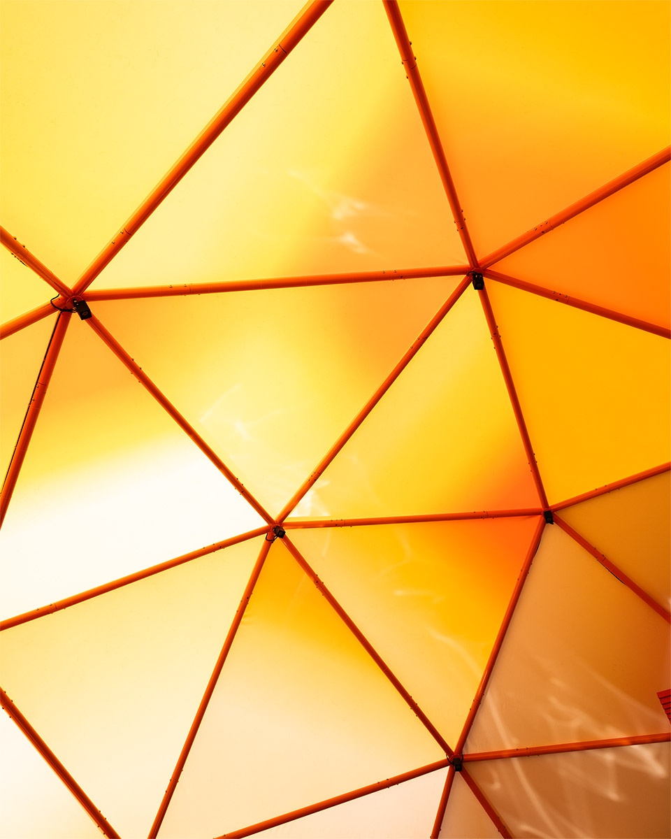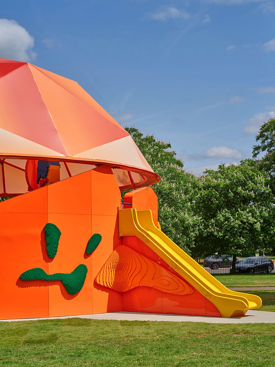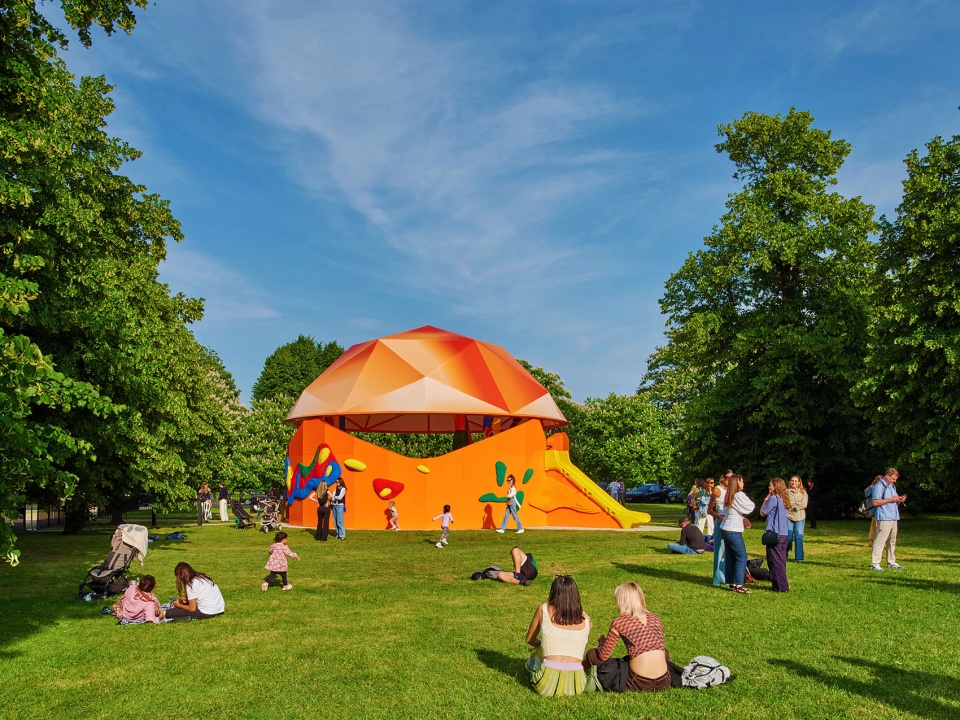 这个展亭坐落于树林之间,邻近一座知名的文化机构,正对2025年蛇形画廊展亭,距离标志性的蛇形湖仅几步之遥。因此,它在空间中扮演着一种呼应与调和的角色——像个小丑、一个爱搞怪的孩子,邀请路人走进它,与它一同玩耍,成为这个欢乐装置的一部分。