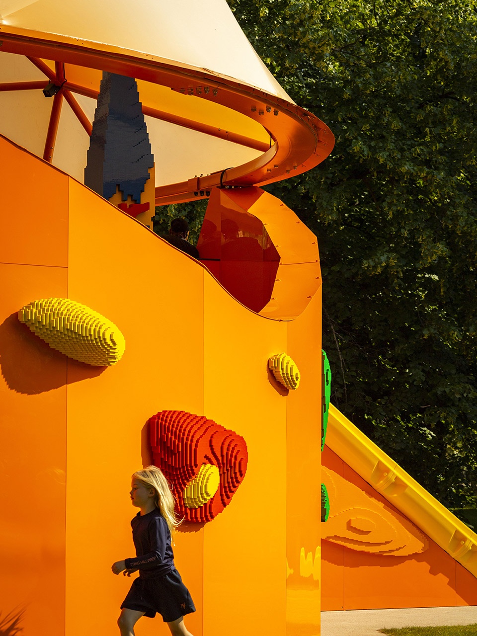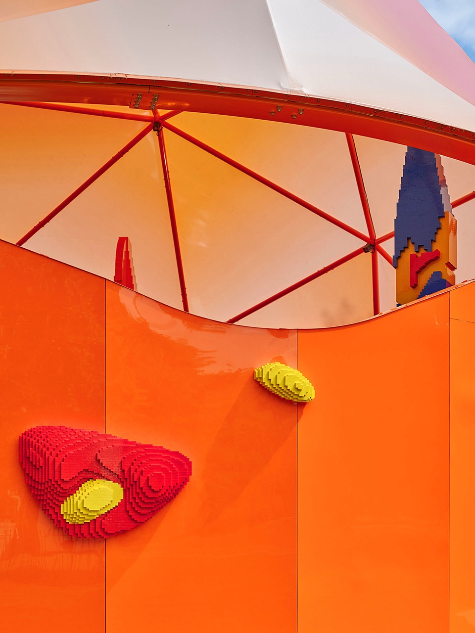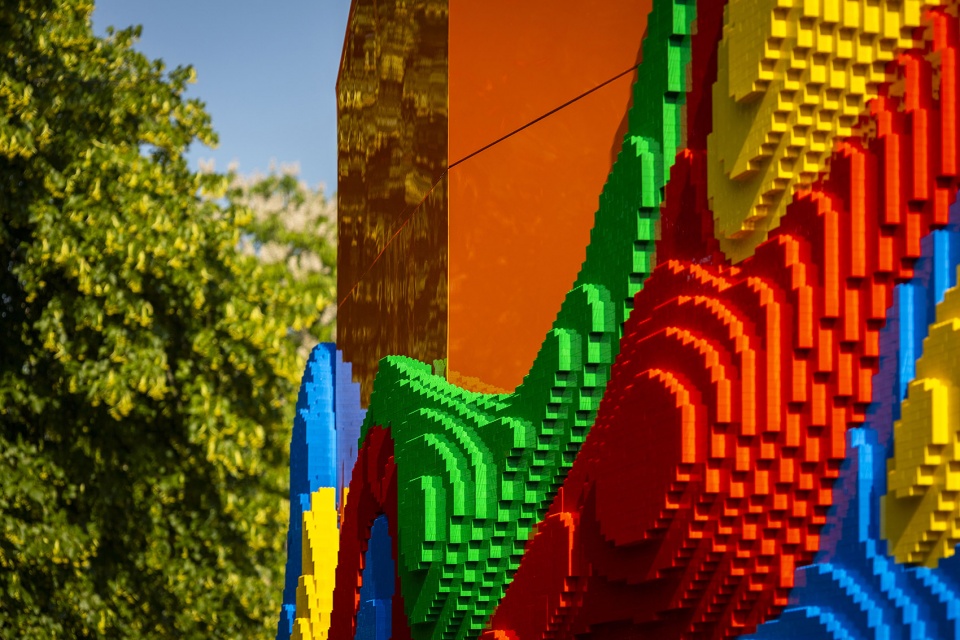 Upon closer inspection, the well-loved creative toy – LEGO is integrated into the design with a continuous flow of lively shapes. The entire Play Pavilion is a graphic toy. Inside there are large swathes of LEGO panels inviting visitors to make their own castles, forests, homes, space-worlds or entirely random inventions, contributing to the overall Gesamtkunstwerk (total work of art). It’s a space for gatherings, small events, workshops and performances.