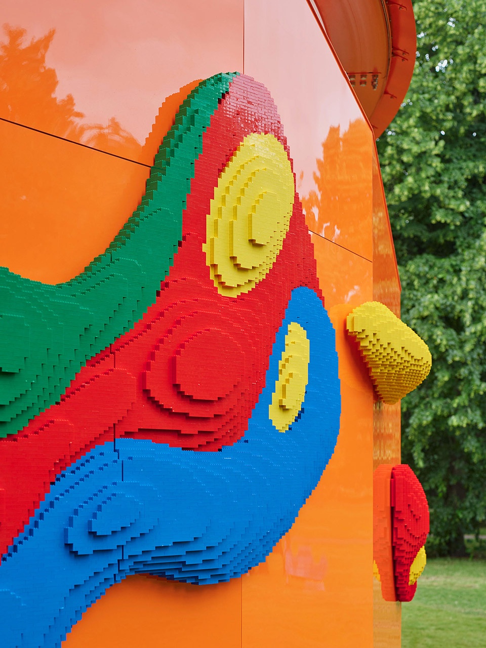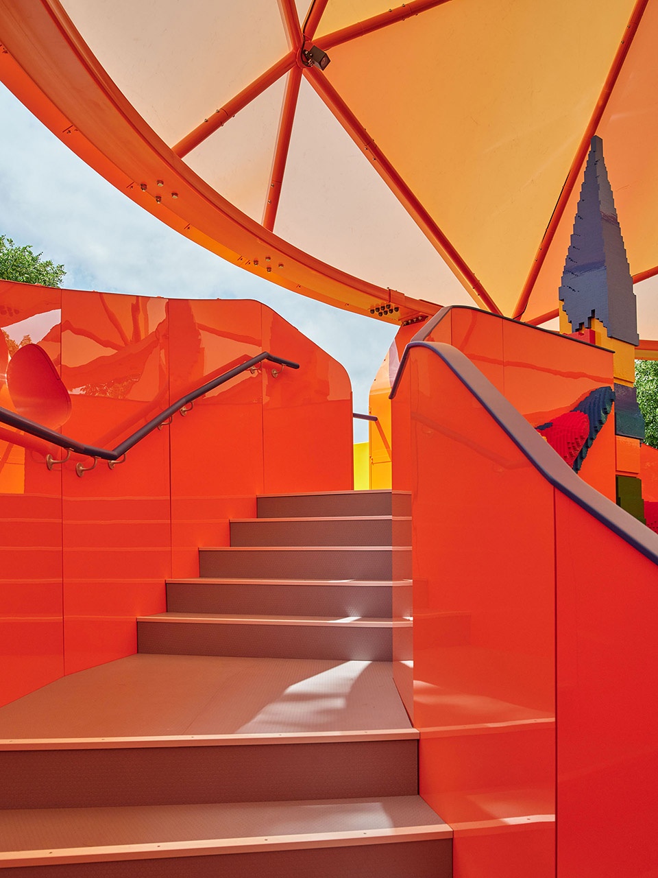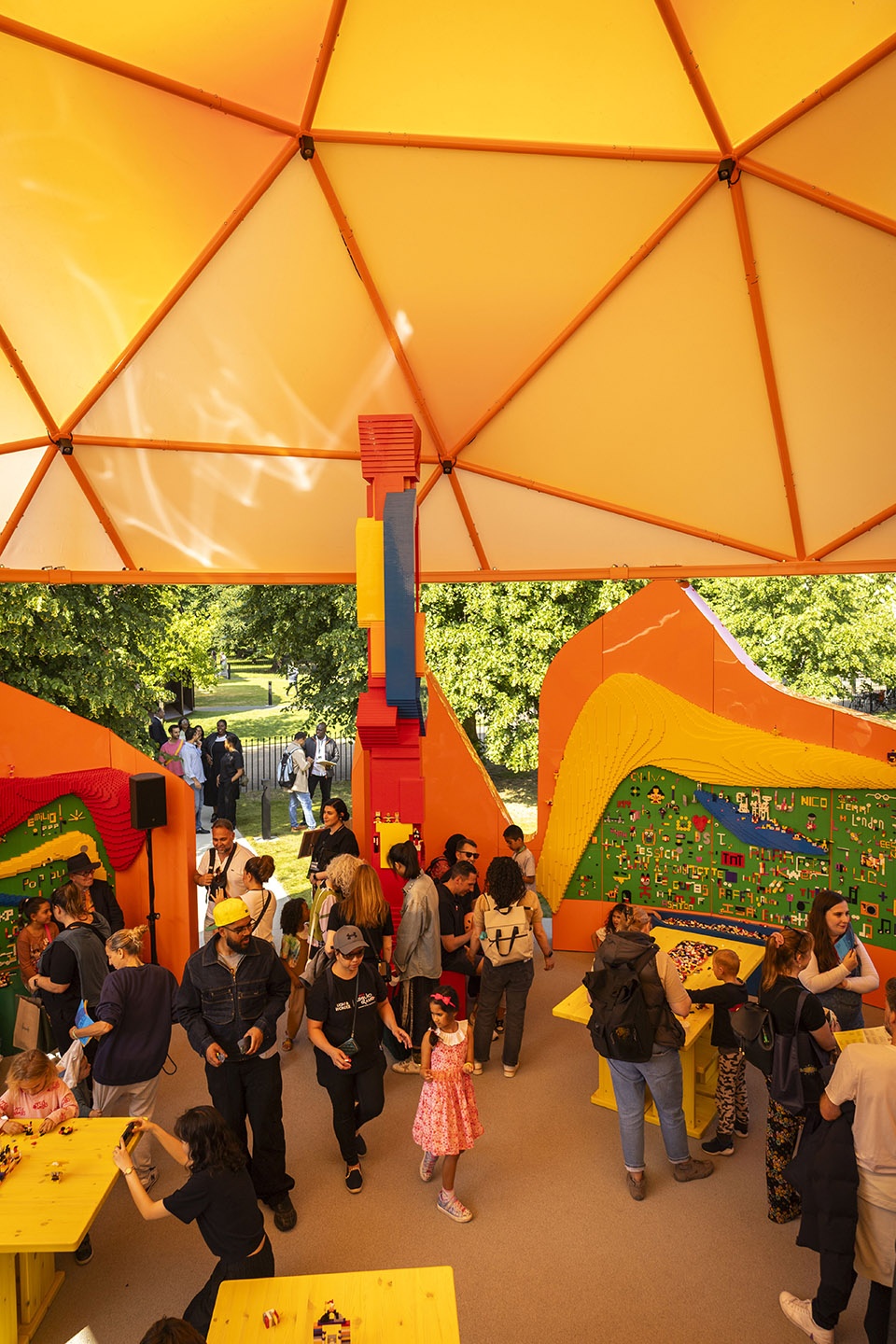 Upon closer inspection, the well-loved creative toy – LEGO is integrated into the design with a continuous flow of lively shapes. The entire Play Pavilion is a graphic toy. Inside there are large swathes of LEGO panels inviting visitors to make their own castles, forests, homes, space-worlds or entirely random inventions, contributing to the overall Gesamtkunstwerk (total work of art). It’s a space for gatherings, small events, workshops and performances.