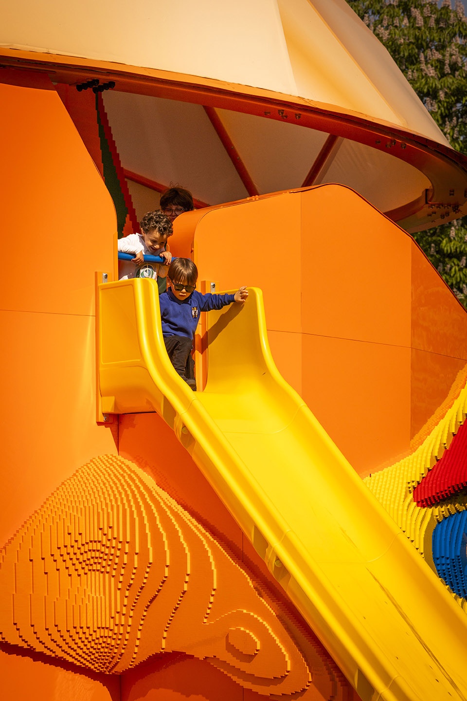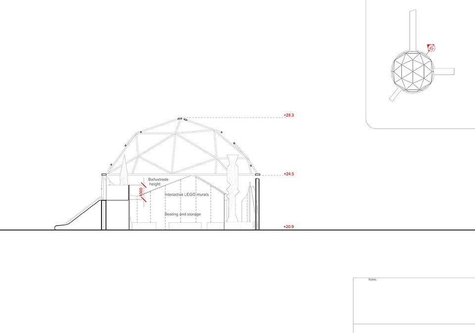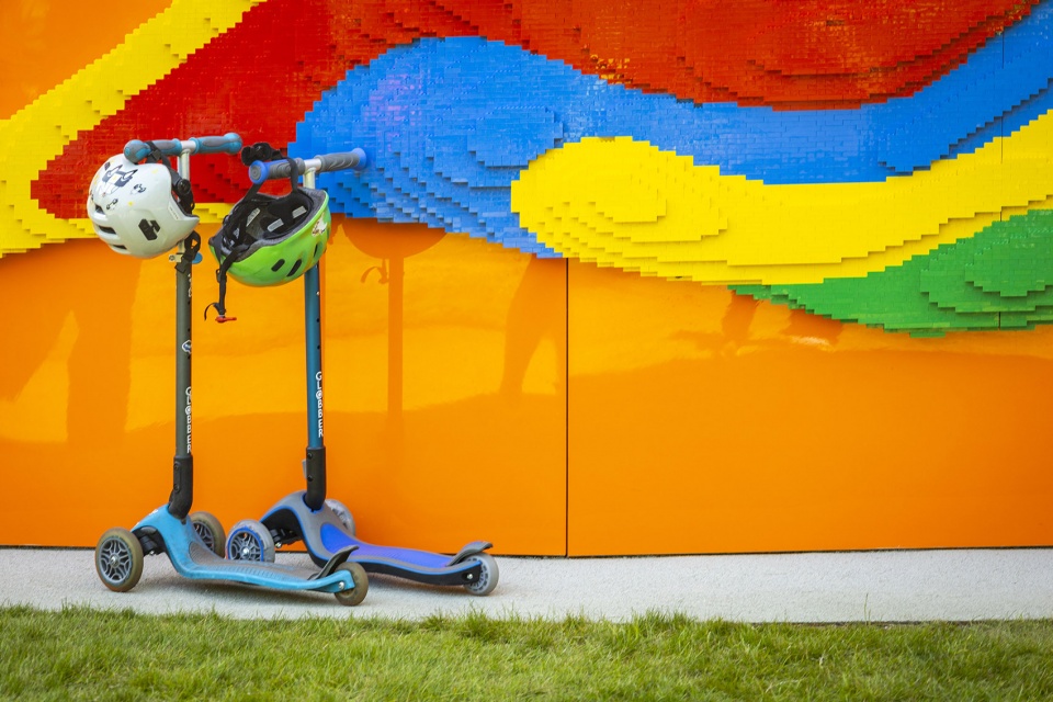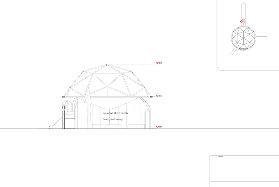 The Play Pavilion is a dome with surfaces that vary in intensity. The project involved the drawing and re-drawing and re-drawing of the pictorial elements in order to balance the hot spots and the action zones. Its colourful dome transition toward a translucent base, playing against the LEGO clad towers, each has a distinct character: either Art Deco, almost Gothic, or almost cartoon-like, and all inviting your engagement.