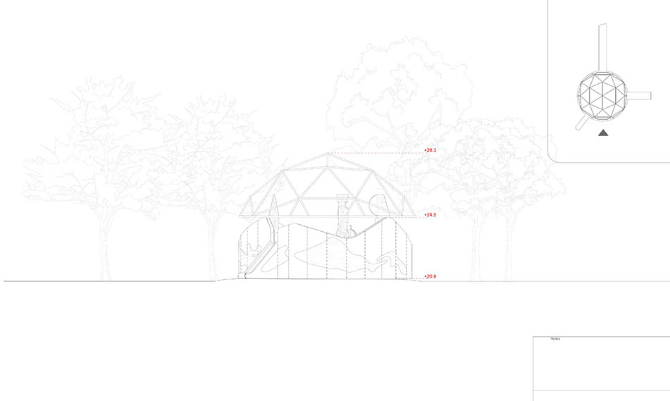 It is a piece of theatre. From a distance, intriguing shapes rise from within the structure, although partly obscured. Inside, the walls are pierced and scooped-away, welcoming you to come inside and sees more, engage in the activities. A child might pop out on a slide, another may crawl through a hole on the ground, mystifying conventional entrance routes. Another, mouth-shaped opening, reveals an orator, performer, or singer entertaining eavesdroppers beyond.