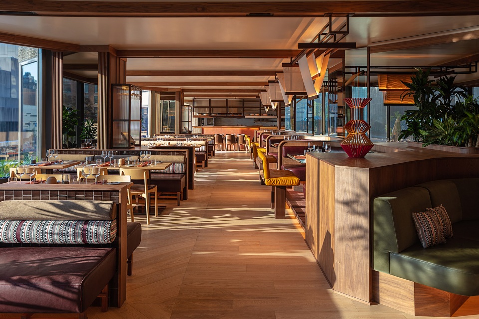 在新餐厅与用餐区的设计中,首先引入了大量整齐排列、朝上竖立的独木舟桨,将空间外缘框定,同时作为早餐区与餐厅之间的视觉过渡。主题还通过一系列设计元素延续,例如环绕酒吧区域的马赛克拼花地砖、以皮带绑缚的靠背座椅(灵感来源于野餐毯),以及托特姆造型的灯具,在帆布灯罩下散发如同营灯般的温暖光芒,隐约呼应帐篷材质。