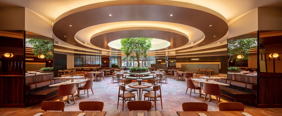 在此理念指引下,团队在现场勘察时发现,早餐区上方原本封闭的天窗。于是他们重新打开天花板,恢复了天窗结构,引入自然光线。天窗成为整个项目的核心元素,设计团队更不惜动用起重机,将一棵大型树木直接植入室内,通过天窗吊装而入。这一举措成功确立了早餐区的空间轴心,整个项目围绕这一中心展开。天花板上同心圆形的装饰线条仿佛水波荡漾,自定义灯具与悬挂植物进一步营造出明亮而富有当代感的氛围。