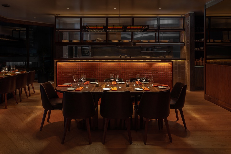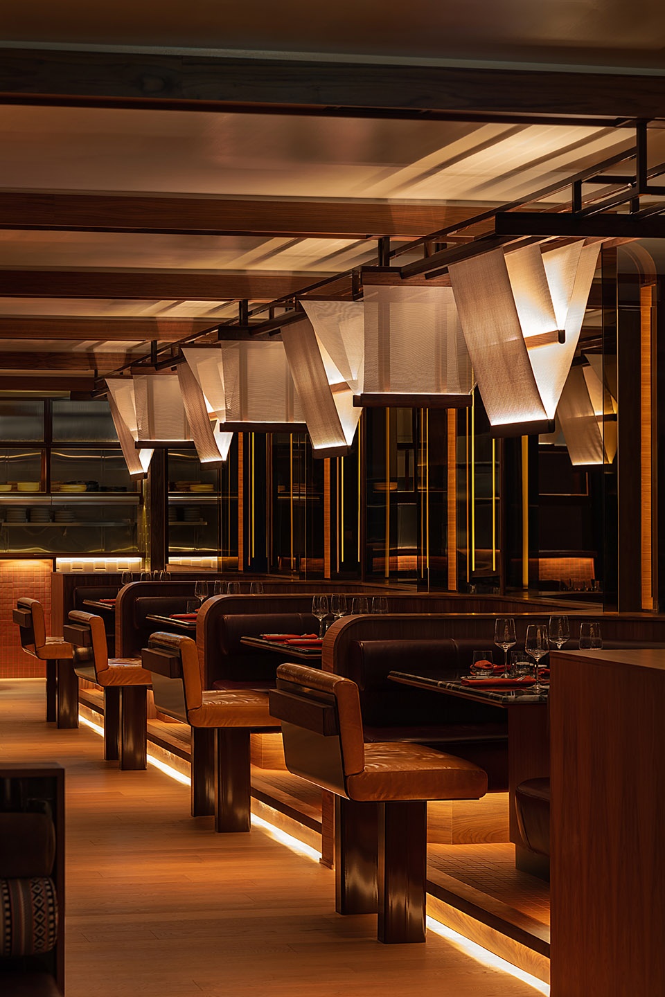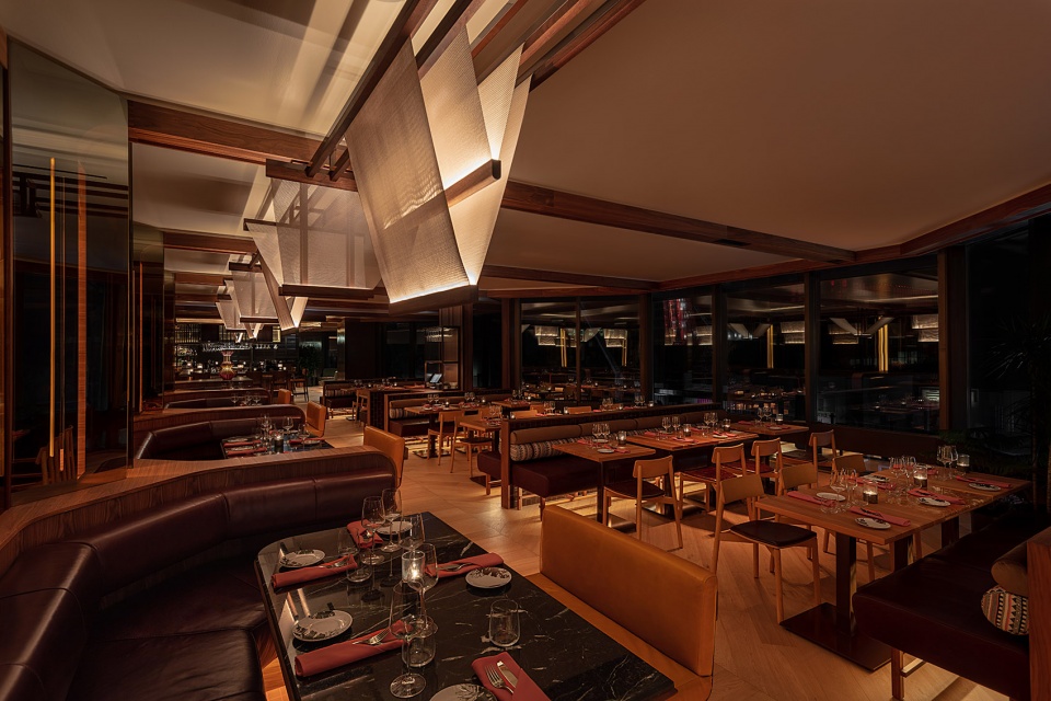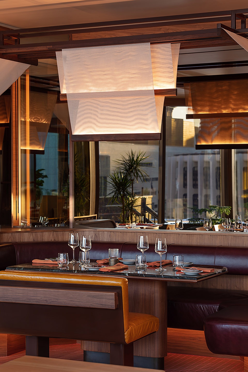 酒吧区域延伸至Bivouac餐厅用餐区,内部氛围温暖,搭配丰富的大理石、天鹅绒与硬木材质。环境光在垂直镜面与琥珀色玻璃板之间交错反射,由Atelier Zébulon Perron事务所与灯饰品牌Lambert et Fils联手设计的定制灯具,确保了日夜皆宜的照明效果。餐厅还配备了皮革软包长椅,以舒适体验为导向,大面积窗户可俯瞰活力四射的表演艺术区(Quartier des spectacles),眺望艺术宫(Place des Arts)及蒙特利尔当代艺术博物馆(MAC)。此外,餐厅设有一间开放式展示厨房,并设有两张主厨餐桌,同时服务于相连的餐饮空间。
