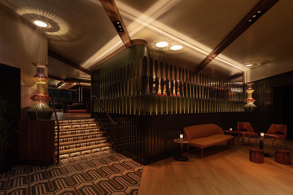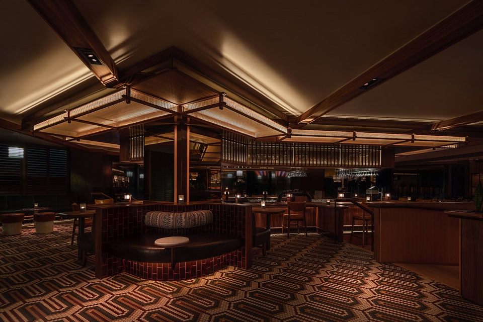 Located on the 4th floor, the area can be accessed from either the reception area of the hotel lobby, or via the adjacent meeting rooms, with direct access to the bar and restaurant on one side of the elevator core, and direct access to the multi-functional breakfast space on the other. All of the spaces are connected internally, with a pool table and restroom area serving as a transitional space between the bar and the breakfast area. A few short stairs rise to the main bar area, designed as a warm and inviting space for congregating. The bar is further articulated by several smaller pockets of adjacent lounge space, providing options for more intimate gatherings.