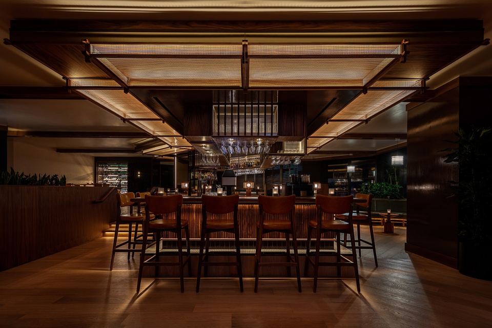 In approaching that endeavour, and upon inspecting the premises, the architects discovered an existing skylight above the space that had long been sealed. They reopened the ceiling to expose the skylight, thereby infusing natural light into the space. The skylight became the central component of the entire project, and the firm went to great lengths to source and plant a large tree directly into the space itself. A crane was required to insert the tree through the skylight, and the successful endeavour created an axis in the breakfast space around which everything else in the project would be articulated. Concentric rings on the ceiling emanate from the central opening like ripples of water, and custom-designed lighting fixtures and hanging plants further contribute to a bright and contemporary ambiance.