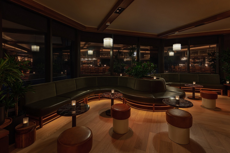 In translating the concept to the setting of a new restaurant and dining room, one of the first elements introduced was an abundance of neatly arranged, upward-facing canoe paddles, aligned to frame the external perimeters of the space and to serve as a gateway between the breakfast area and the new restaurant. The theme is further conveyed throughout the space through various design elements that include an intricate mosaic tile pattern surrounding the bar, backrests upholstered and cinched with leather straps that are reminiscent of harnessed picnic blankets, and totem-shaped light fixtures emitting lantern-like glows from beneath canvas shades offering a subtle nod to tent material.
