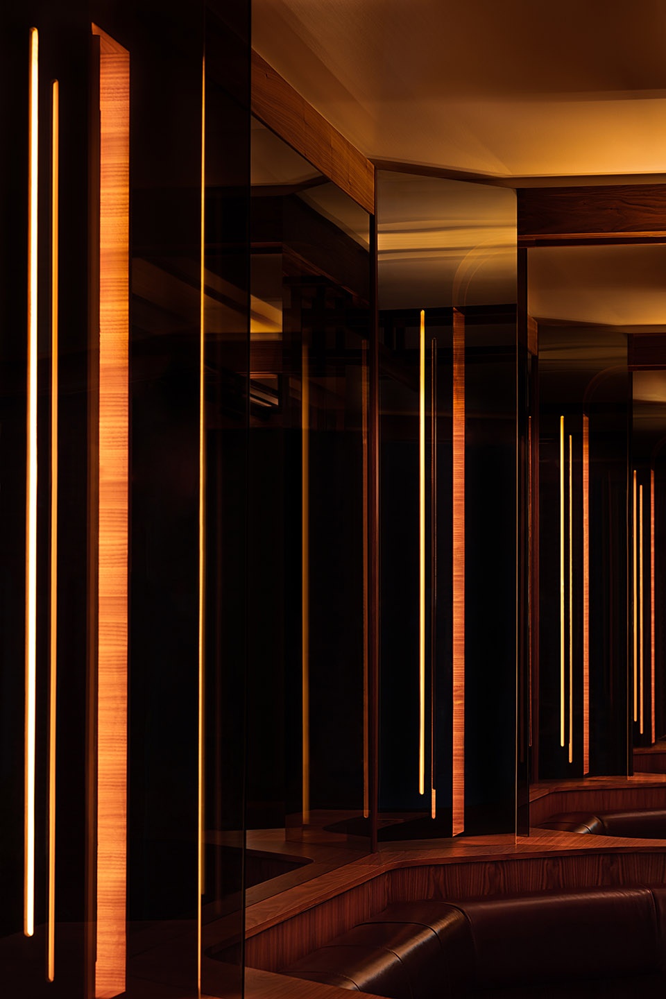 ▼环境光在垂直镜面与琥珀色玻璃板之间交错反射,Ambient light provides playful reflections on strategically-placed vertical mirrors and amber glass panels