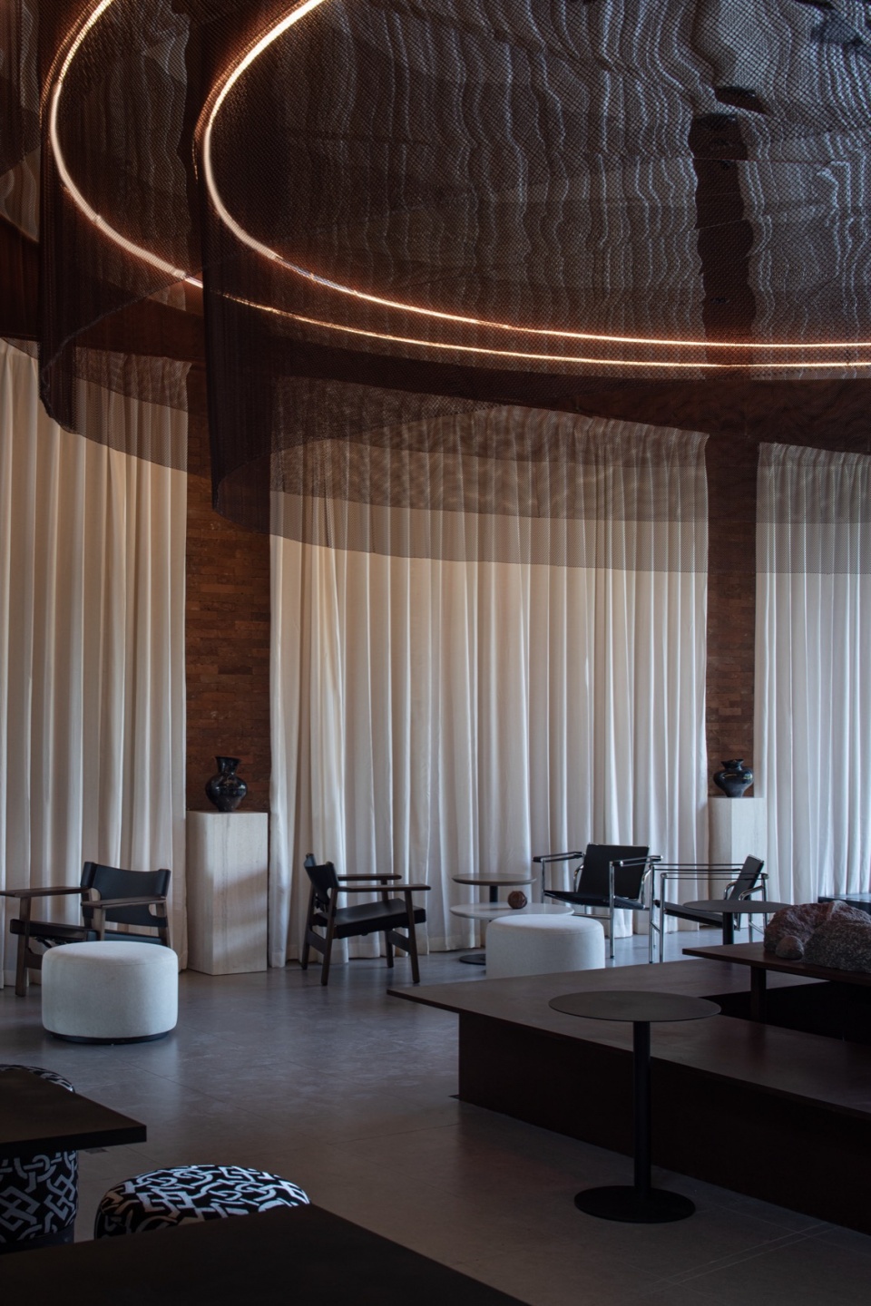 To soften the inherent hardness of the original materials, the design incorporates a lightweight curtain system, introducing a scenographic and curatorial approach to spatial composition. The curtains are not merely decorative—they serve as structural boundaries of perception, softening acoustics and light to create a more immersive and inclusive spatial experience.