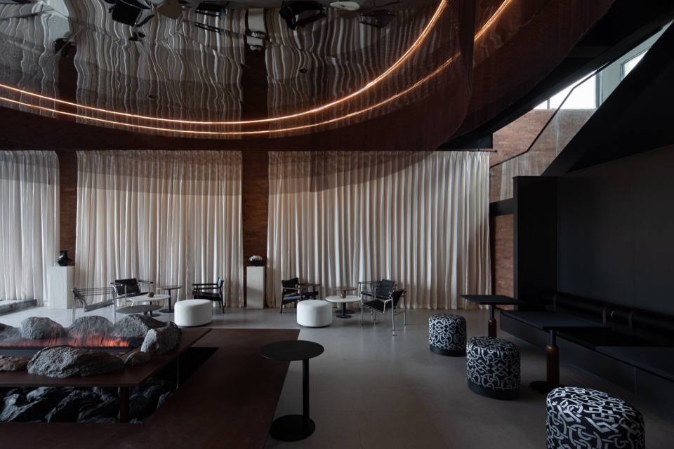 空间的布局策略完全基于“策展”逻辑进行组织。家具采用可移动的组团形式,结合布幕、光影壁炉与顶面圆形镜面的反射装置,不仅营造出如舞台般的灵活场景,也通过镜面引导视线上移,使空间感得以延展,并与自然光线形成柔性互动。