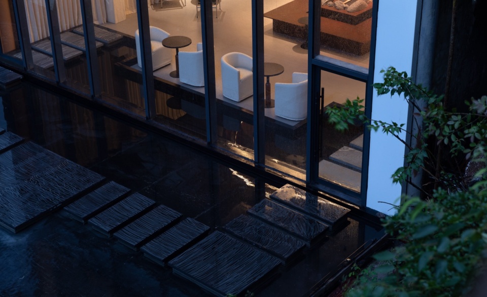 设计进一步引入自然要素——我们在空间界面上延展水体,通过开窗与水平延伸,将室外的自然肌理引入室内,使空间边界变得模糊。水面与天光共同作用,形成多维度的感知回响,也激活了建筑与自然的对话关系。
