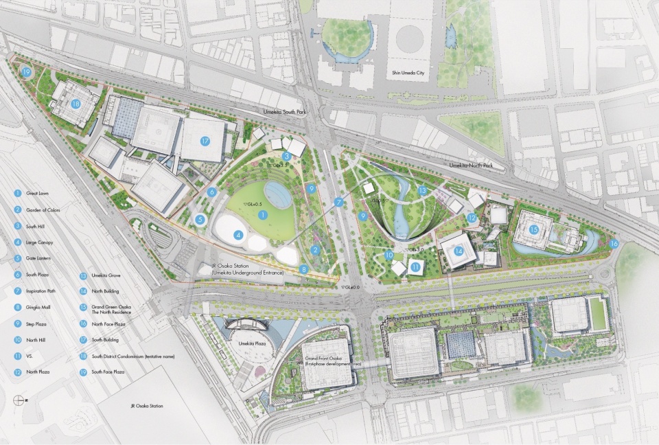 ▼与GRAND FRONT大阪和新梅田City一起环绕公园,surround the park with GRAND FRONT Osaka and Shin-Umeda City