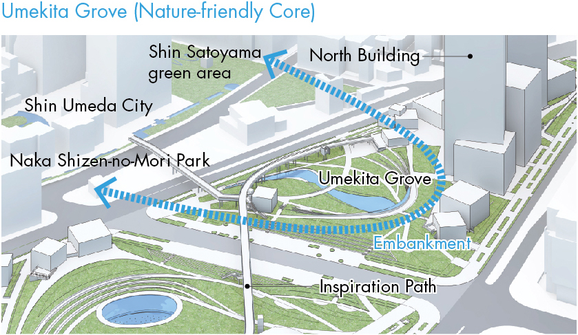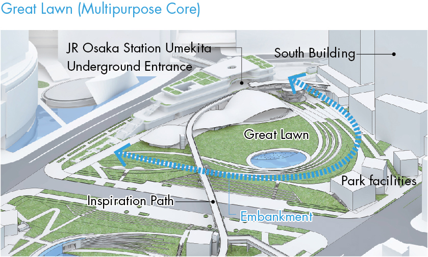 Embankments were created to gently introduce elevation changes between and within the north and south parts of the development. The variations in elevation not only integrate the site as a whole but also establish three principal “cores” in the park’s layout. These include the Great Lawn, which is the South Park’s multipurpose space facing onto JR Osaka Station; the Step Plaza, which merges with the street that accommodates both pedestrian and vehicle traffic crossing between the north and south areas; and the North Park’s multifunctional natural space, Umekita Grove, which connects to the Shin Satoyama green area and Naka Shizen-no-Mori Park at Shin Umeda City. These “cores” are designed to transcend the boundaries separating roads, parkland, private land, and the surrounding neighborhoods, thereby enhancing the allure of the entire area, including that beyond the site itself.