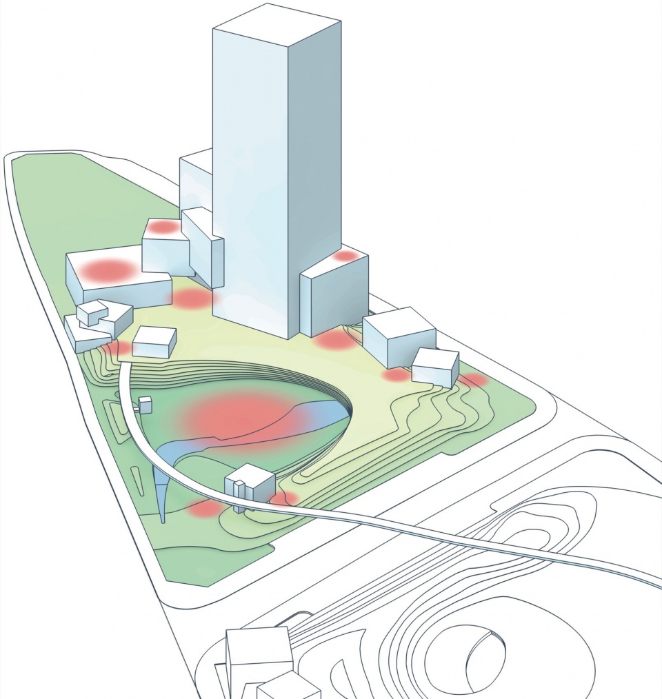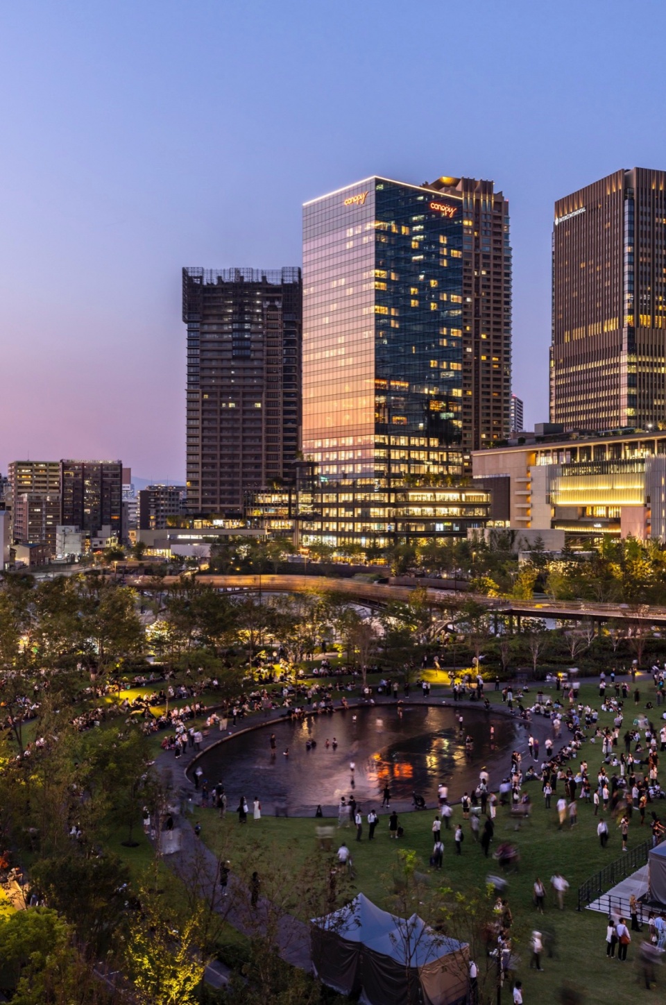Umekita Phase 2, located on the former site of the Osaka Station North Area Freight Yard, said to be the last area of prime real estate in the Kansai region, is a large-scale complex development with a total floor area of over 550,000 square meters. The approximately 9-hectare site, designated for urban development mainly at local government initiative, consists of a central urban park of 4.5 hectares and 4.6 hectares of private land. Strategically located, it connects to JR Osaka Station and the surrounding city. In collaboration with landscape design firm GGN, the entire site was transformed into an integrated public park. Embankments create differences in elevation, transcending the boundaries of parkland and private property for a design to promote continuity of the area and vitality in its use. The built program, ranging from densely arranged mixed use high-rise buildings on the private land to low-rise facilities and single-story park structures, are all designed with square floor plans and arranged as a cohesive group clustered around the park. At the same time, variation in the angles and stacking of the building volumes give rise to spaces rich in greenery and alive with activity.