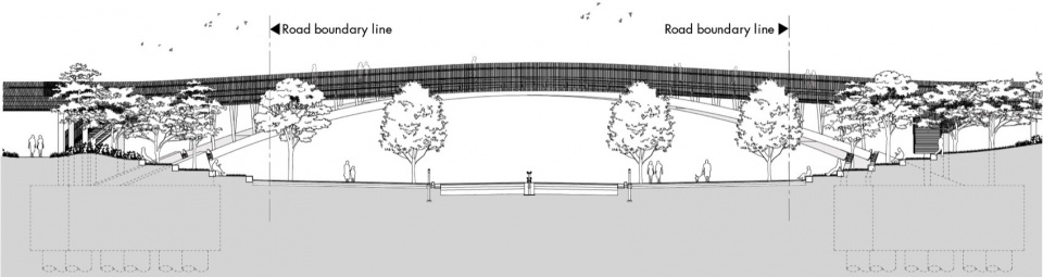 通过在面向道路空间的区域打造地貌,设置约90m长的石阶长椅,将分隔南北公园的道路设计成与公园一体的开放空间。坐在长椅上看着人行道上来来往往的行人,在公园与道路、South Park与North Park之间建立一种“看与被看”的关系,使公园的熙攘喧嚣自然延伸至道路空间,成为活力与景观连绵不断的公共空间。在道路上方,一条叫做“灵感长廊”的空中园路斜穿而过,以立体的方式将南北公园连接为一个整体空间。在道路铺装材料和道路设施方面,选择能感受到与公园连为一体的材料与陈设,在营造出繁华氛围的同时,还有助于实现“景观的连续性”。