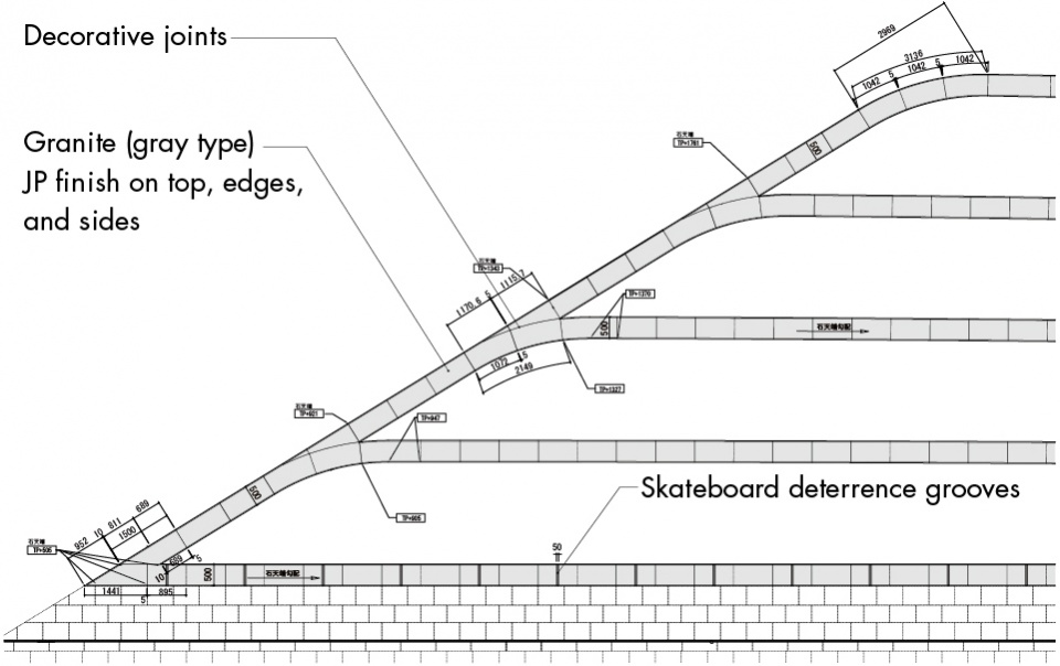 Embankments were built adjacent to the road that runs east-west through the development. Stone benches stretching approximately 90 meters were arranged to create a continuous open space that integrates the road—which would otherwise divide the development’s north and south areas— with the two parks. As people sit on the benches and observe passersby on the sidewalk, a lively dynamic of “seeing and being seen” is established between the parks and the road, as well as between the two parks themselves. The vibrant atmosphere of the park spills out onto the street, resulting in a seamless public space where the landscape is inseparable from the activity it inspires. Above the road, the elevated “Inspiration Path” cuts across the space, dynamically connecting the North Park and the South Park. The choice of paving materials and street furnishings that reflect the integration with the two parks also helps to create a dynamic atmosphere and foster a “borderless” landscape.