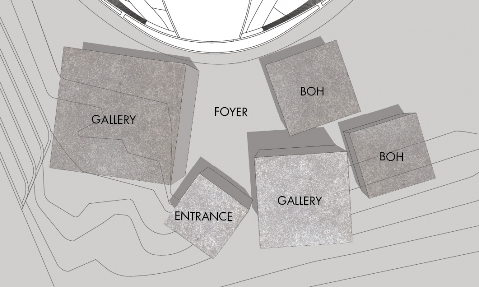 “VS.”是一座面积达3,500m2的博物馆,其中约3,000m2建在公园地下。地面上只保留玻璃与混凝土两个标志性体量,其余三个体量规划到地下,以尽可能地将地面空间释放给公园。考虑到地面植物的生长,需确保约1.5m的覆土厚度,因此根据公园地形精确设定了地下建筑的高度。五个体量间的留白形成了地下门厅,这里不仅有展厅之间的自然光,还有透过North Park瀑布(计划于2027年完工)从上方倾泻而下的光线,明暗交错的光影激发着人们的创造力,是一个动感十足的地下空间。此外,贯穿地下门厅的连廊是直接连接公园、展区与主干道的动线,促成不经意间的邂逅。这座博物馆标志着公园内博物馆新型态的诞生。