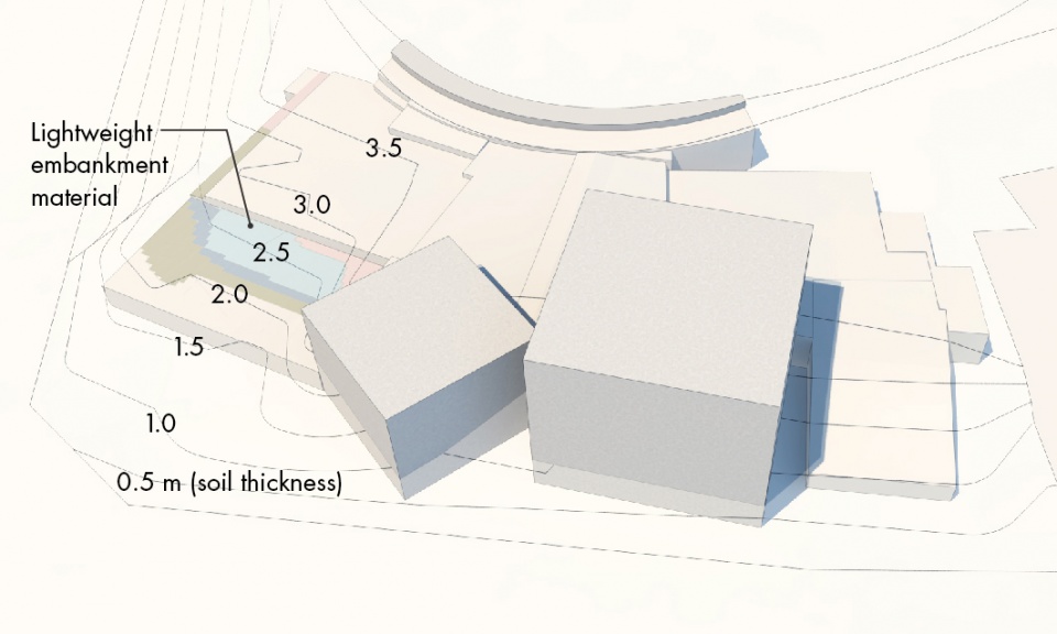 ▼确保1.5m的覆土层厚度以保障植物生长,余量部分采用轻质填土材料的合理设计,Ensure a 1.5m soil cover thickness to ensure plant growth, and use lightweight fill material for the remainder