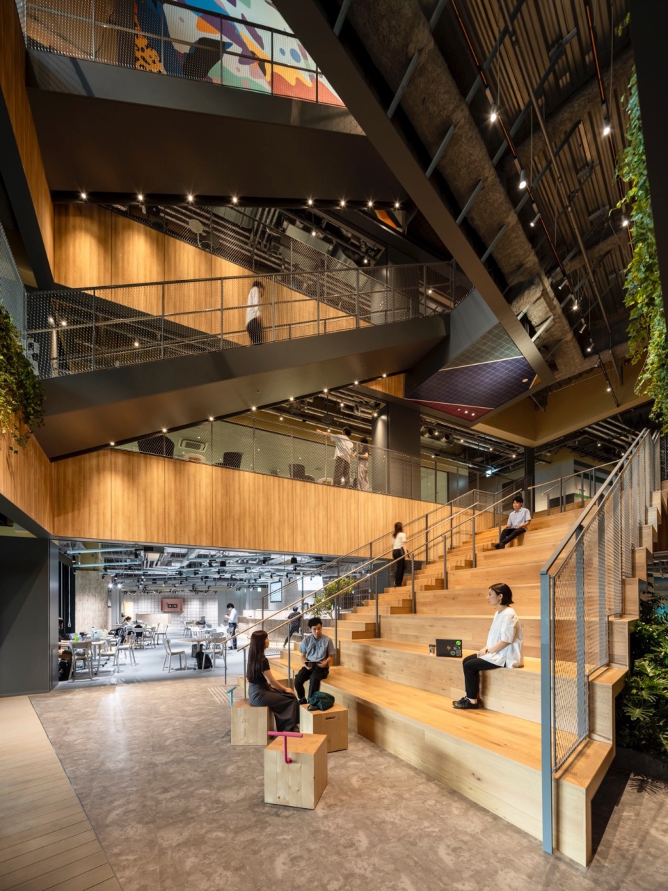 The lower floors of the North Building are the site of Jam Base, the focal point of the innovation-driven vision for Phase 2 of the Umekita Project; the upper floors house a lifestyle hotel. The atrium incorporates the greenery of the park and the rooftop plantings into the interior space. The mixed-use building’s layered urban functions are stacked as a collective volume rising out of the adjacent North Park, creating an integrated public space. The volumes are stacked in a terraced arrangement, and piloti spaces, staircases, and rooftop gardens are situated among the volumes. This greenery is intended to blur the lines between interior and exterior, encouraging activity and interaction.
