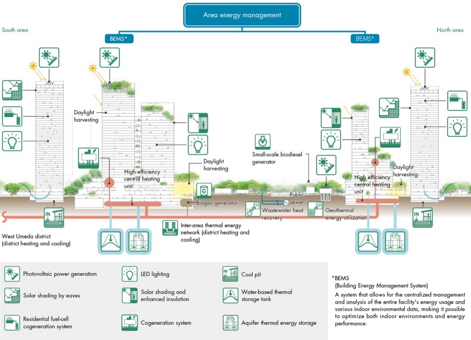 通过在南北两个街区统一管理热电联产系统和集中供热供冷系统,实现与区域外的能源合作及灾害时的能源自给。整个GRAND GREEN大阪的目标是减少35%的二氧化碳排放量,这大约相当于9,700ha(面积约为梅北公园的2,100倍)森林的二氧化碳吸收量。在包括城市公园的综合开发项目中,这是日本首个获得国际环境性能认证制度“LEED”中ND(社区开发)类金级认证(规划认证),以及主要评估景观可持续性的认证制度“SITES”金级认证(预认证)的项目。