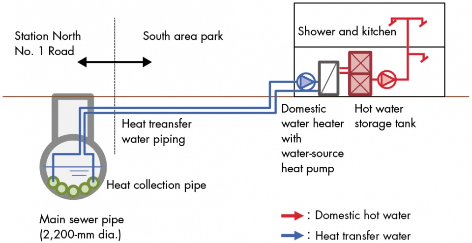 由于日本国家战略特区制度放宽了对建筑地下水开采的限制,本项目得以实现日本首个大型含水层蓄热1系统。该系统直接利用地下水位高、砂砾层厚的地层特征,在地下45–55m的砾石层中,夏季储存冷气设备产生的废热用于冬季采暖,冬季则储存排出的冷能用于夏季制冷。这种废热再利用不仅节约能源,还能减少大气热污染,从而缓解热岛效应。此外,利用横贯南北公园间人行道的东西向下水道基础设施,开发了污水余热利用系统2,并将其整合到公园内设施的热水供应用热源中。